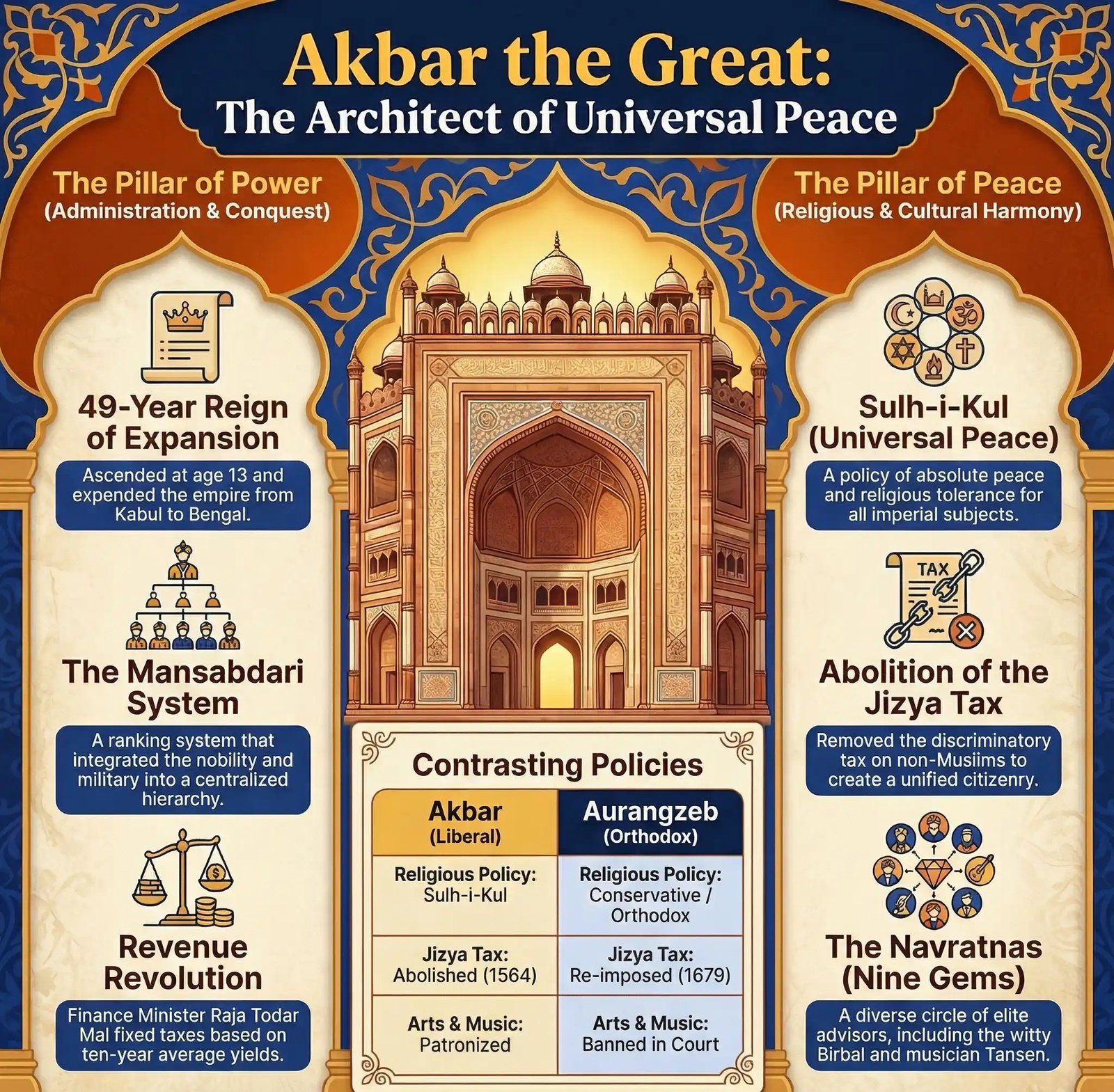 - Abolition of Taxes: He abolished the Pilgrimage Tax (1563) and the hated Jizya tax (1564) on non-Muslims, winning the hearts of the Hindu majority.