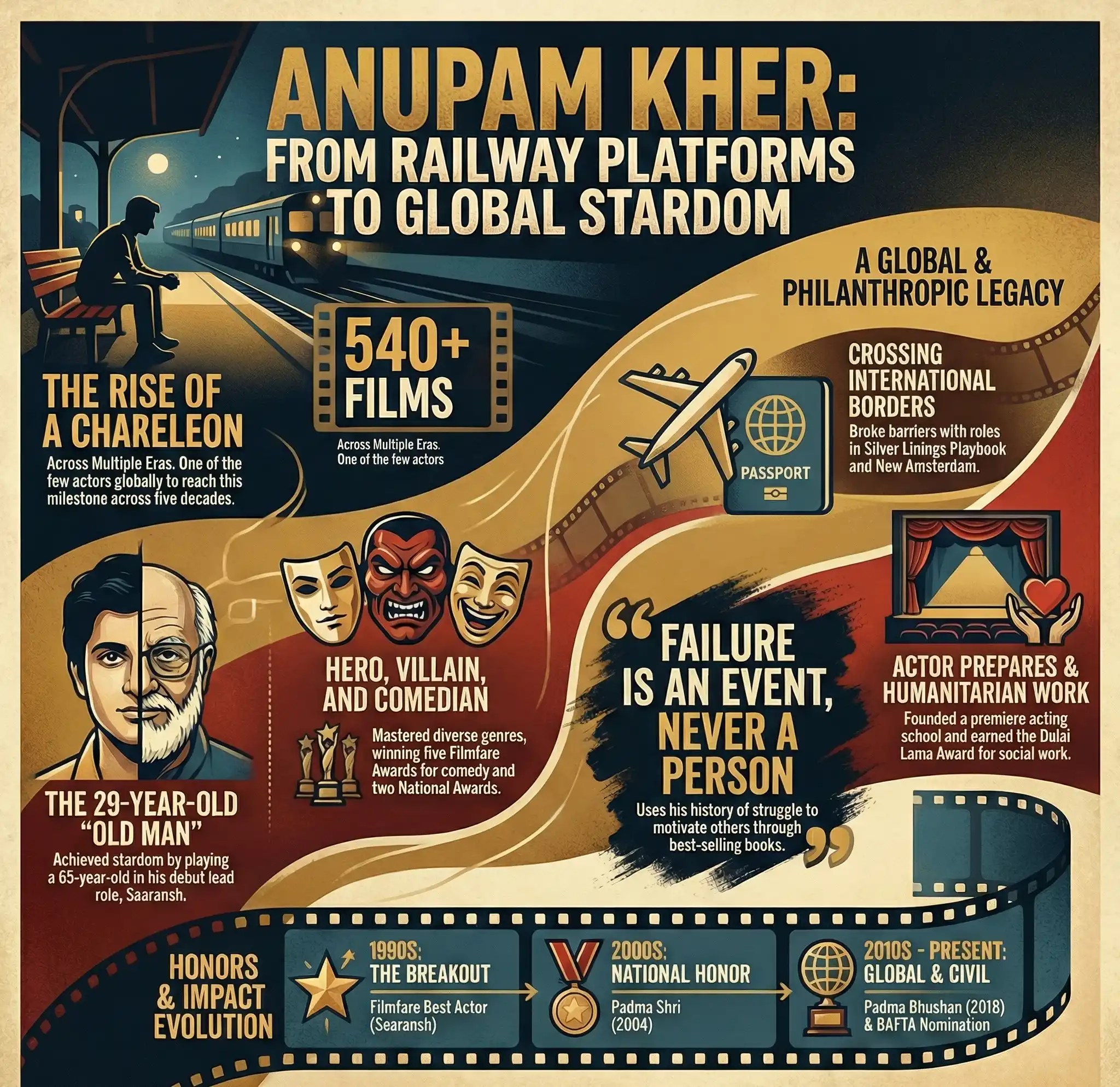 Anupam Kher is a legendary Indian actor, teacher, and author who has appeared in over 540 films in multiple languages. Born in Shimla in 1955 to a Kashmiri Pandit family, he overcame significant early struggles—including sleeping on railway platforms in Mumbai—to make his mark with the critically acclaimed Saaransh (1984). Known for his versatility, he has effortlessly transitioned between villainous, comic, and dramatic roles. Beyond cinema, he is a dedicated humanitarian, an author of best-selling books, and a motivational speaker who champions the philosophy that "failure is an event, never a person."