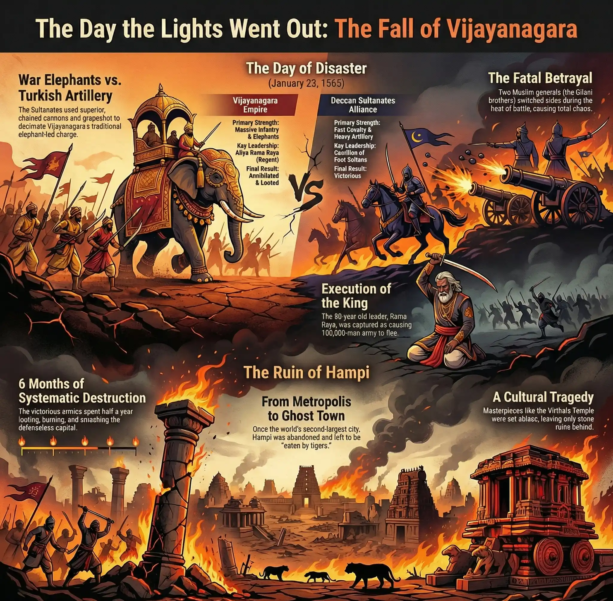 The Battle of Talikota serves as a brutal reminder that military might is useless without diplomatic foresight. Rama Raya’s arrogance united his enemies, and his failure to modernize his army (ignoring artillery) cost him his head. The ruins of Hampi today stand as a silent, haunting monument to the day the lights went out in South India.
