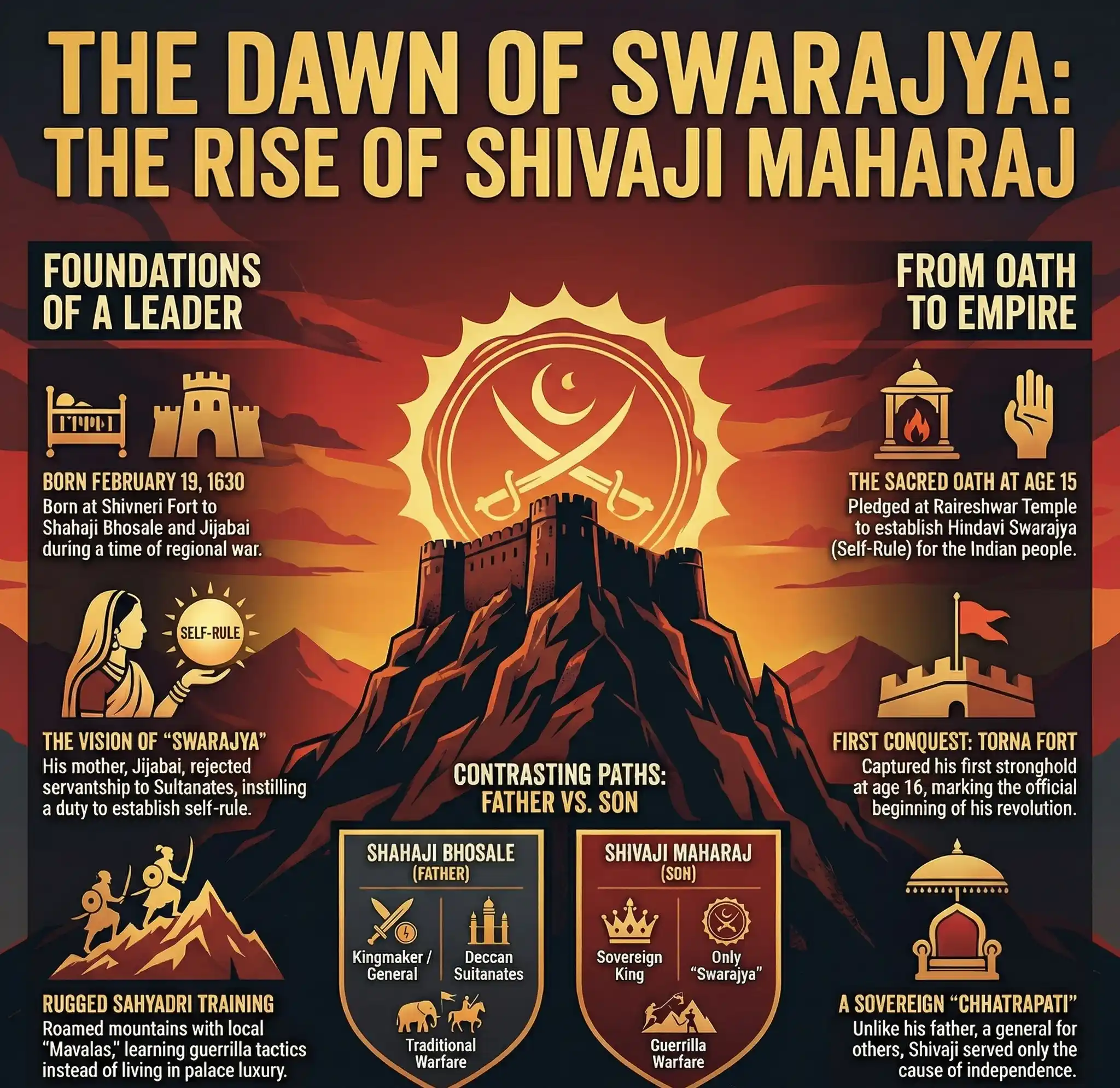 • No Palace Childhood: Unlike Mughal princes who grew up in harems and luxury, Shivaji grew up in the rugged terrain of the Western Ghats, which made him physically tough and mentally agile.