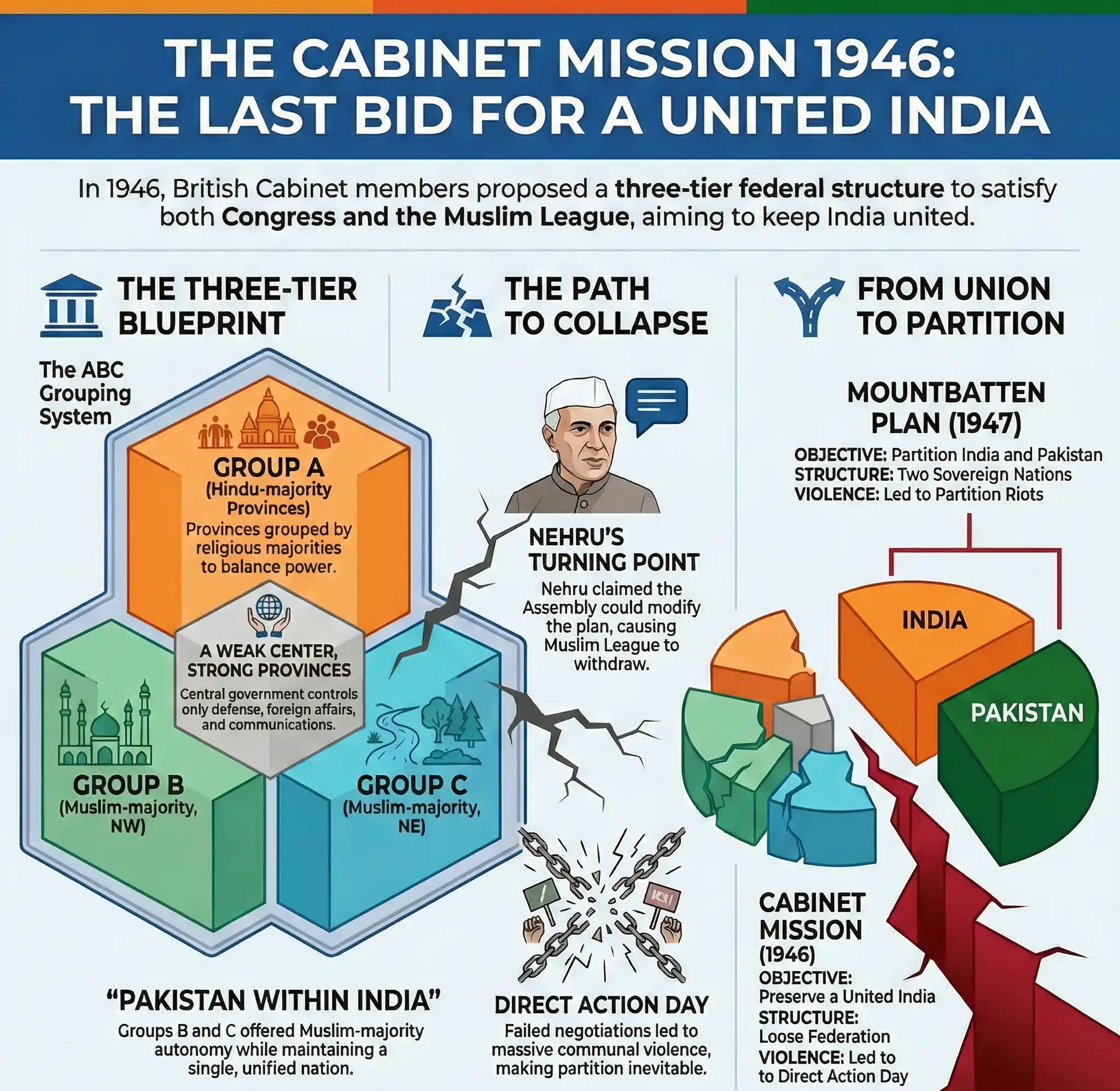 The Cabinet Mission Plan of 1946 was a high-stakes diplomatic initiative launched by the British Government to transfer power to a single, united Indian nation. Led by Lord Pethick-Lawrence, Sir Stafford Cripps, and A.V. Alexander, the mission proposed a three-tier federal structure where the center would control only defense, foreign affairs, and communications, while provinces would hold all other powers. It also introduced a controversial "Grouping System" (Groups A, B, and C) to satisfy Muslim League demands without creating Pakistan. Although initially accepted by both the Congress and the Muslim League, mutual distrust and differing interpretations—specifically regarding the mandatory nature of the groups—led to its collapse. This failure prompted Jinnah to launch Direct Action Day, setting the stage for the violent partition of India.| Feature | Details |