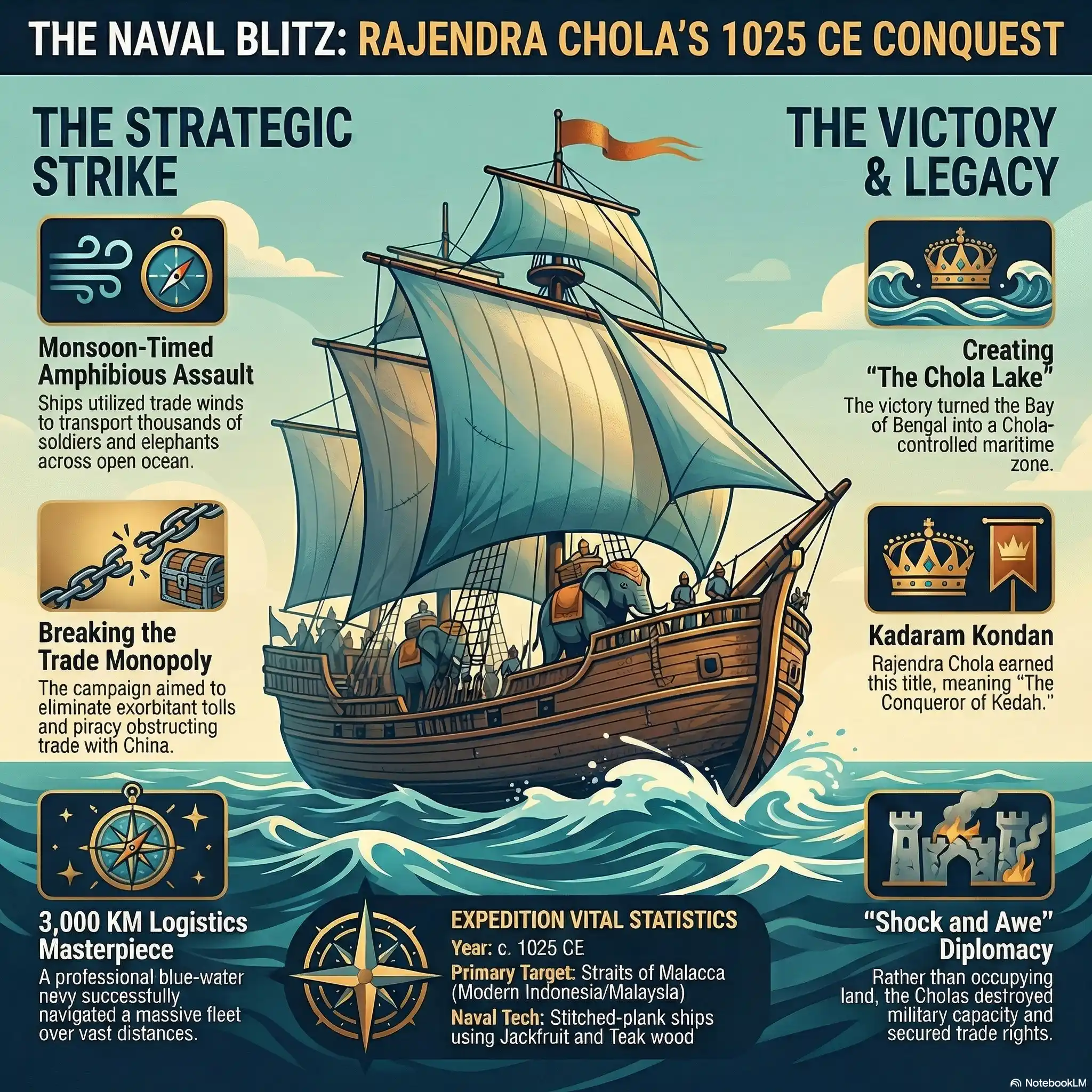 The Chola Naval Expedition of 1025 CE was a military campaign launched by the Chola Emperor Rajendra Chola I against the Srivijaya Empire (modern-day Indonesia, Malaysia, and Southern Thailand). It stands as a unique event in Indian history—a massive amphibious assault across the open ocean. The Srivijaya Empire, a thalassocracy (maritime empire), controlled the Straits of Malacca, the vital choke point for trade between India and China. When Srivijaya began obstructing Chola merchants and demanding high tolls, Rajendra Chola launched a "monsoon-timed blitz." His fleet sacked key ports like Kadaram (Kedah), Pannai (Sumatra), and Malaiyur. The expedition successfully broke Srivijaya's monopoly, opened the trade route to Song Dynasty China, and earned Rajendra the title "Kadaram Kondan" (The Conqueror of Kadaram).| Feature | Details |