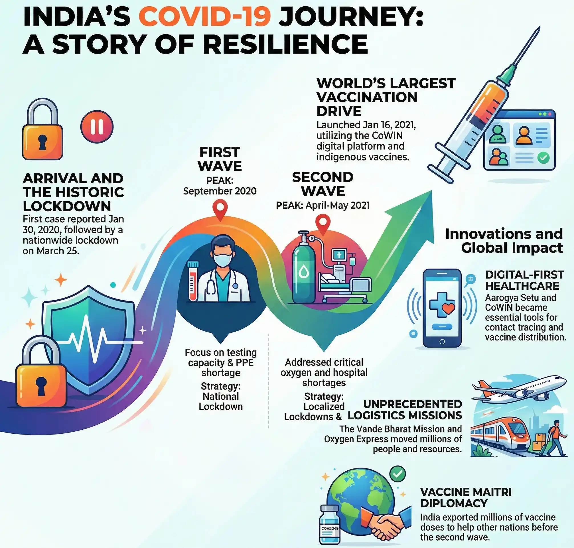 The COVID-19 pandemic in India began with the first case reported in Kerala on January 30, 2020. What followed was a series of stringent public health measures, including a nationwide lockdown starting March 25, 2020. The country witnessed multiple waves of infection, with a first peak in September 2020 and a far more severe second wave in April–May 2021 driven by new variants. In response, India launched one of the world's largest vaccination drives in January 2021, administering billions of doses. The pandemic tested India's health infrastructure, triggered a migrant crisis, and accelerated the adoption of digital health tools like Aarogya Setu and CoWIN.| Attribute | Details |