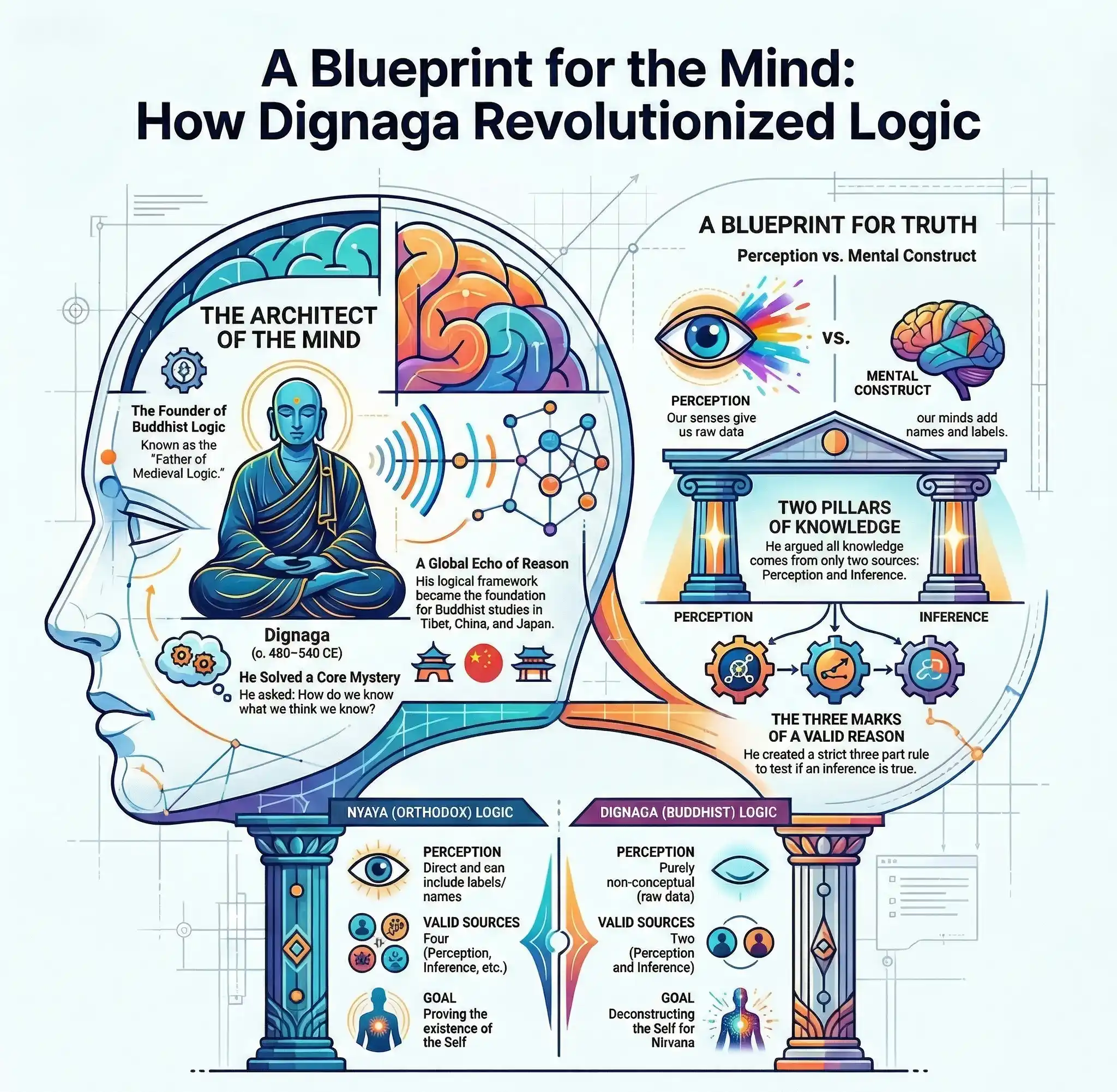 In the quiet monasteries of 5th-century India, a revolution was brewing that had nothing to do with swords or kingdoms. It was a revolution of the intellect. At the center of this storm was a monk named Dignaga, a man whose clarity of thought would eventually earn him the title of the “Father of Medieval Logic.” Through the development of Dignaga Buddhist Logic, he dismantled the traditional ways Indians debated truth and replaced them with a precision that feels remarkably modern.