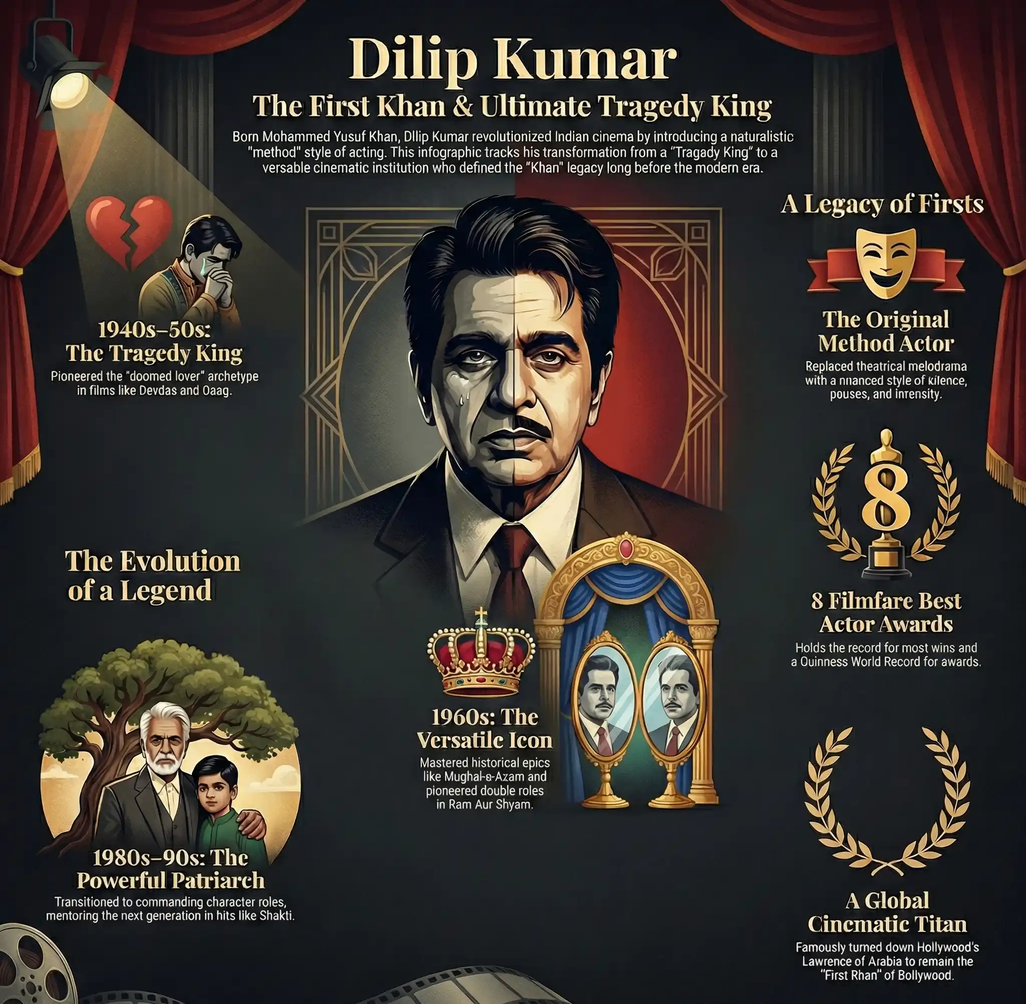 | 1960s | The Versatile Star | Mughal-e-Azam, Gunga Jumna, Ram Aur Shyam | Mastered historical epics, rustic dramas, and comedy. |