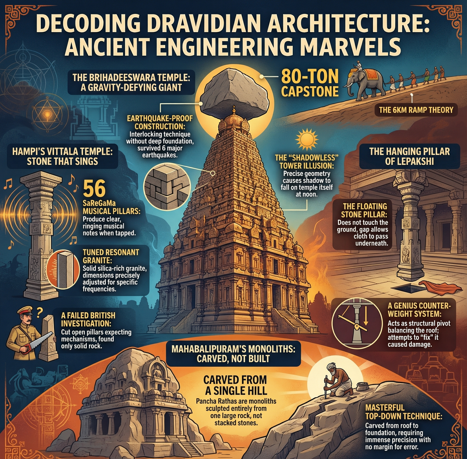 One of the most overlooked “secrets” is the absence of binding material. Dravidian temple architecture does not rely on lime mortar or cement to hold its massive weight together. Instead, it uses a system of interlocking stones.