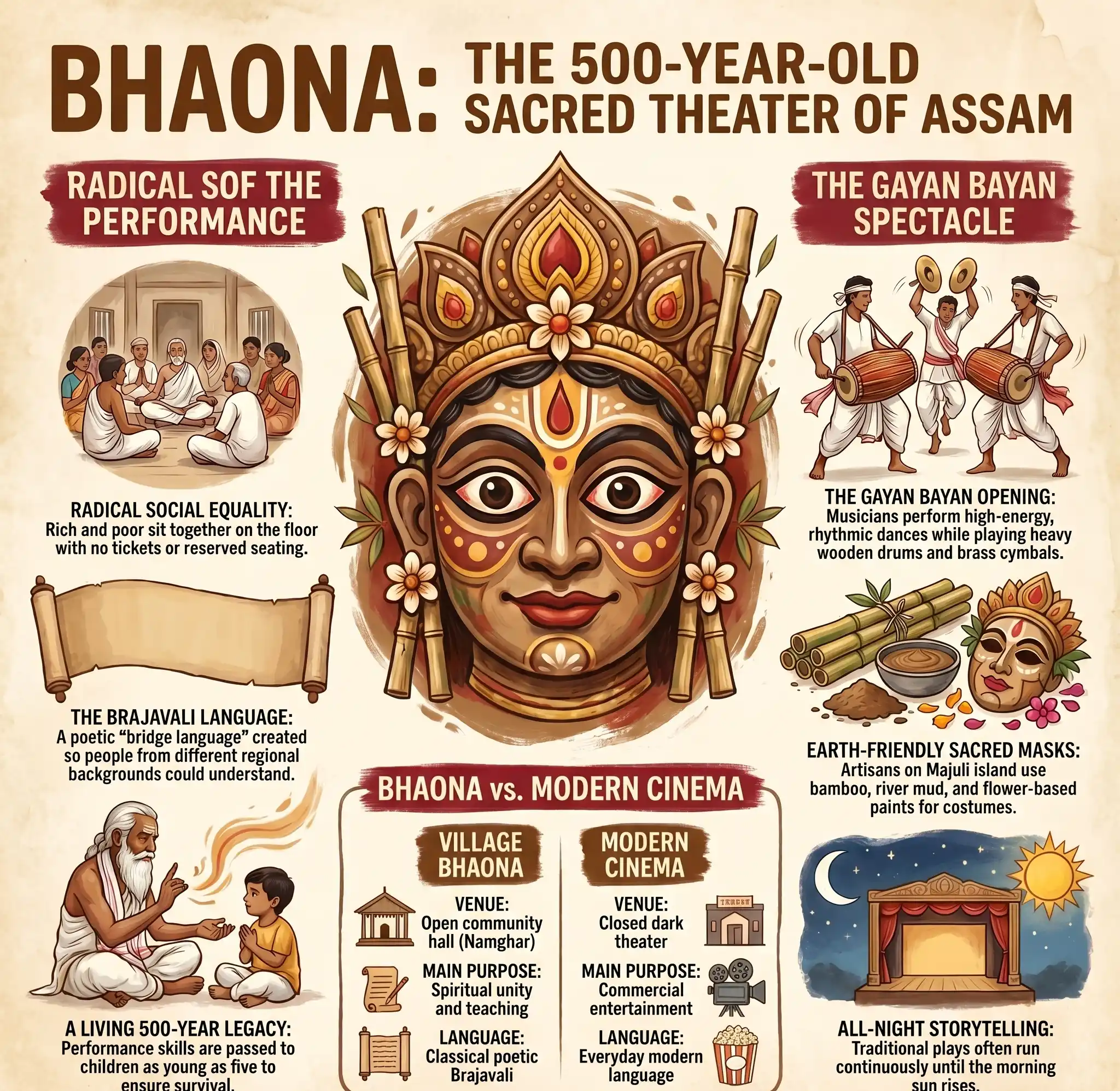 Long ago in the lush green valleys of Assam a wise saint wanted to teach the village people about love peace and equality. He knew that reading heavy thick books was not possible for everyone because many poor farmers did not know how to read. So he decided to use the magic of music drama and colorful costumes to share his message. This brilliant idea gave birth to the Bhaona traditional theatrical arts. It is a spectacular living theater that has survived for over five hundred years completely transforming the way stories are told in the eastern part of our country.