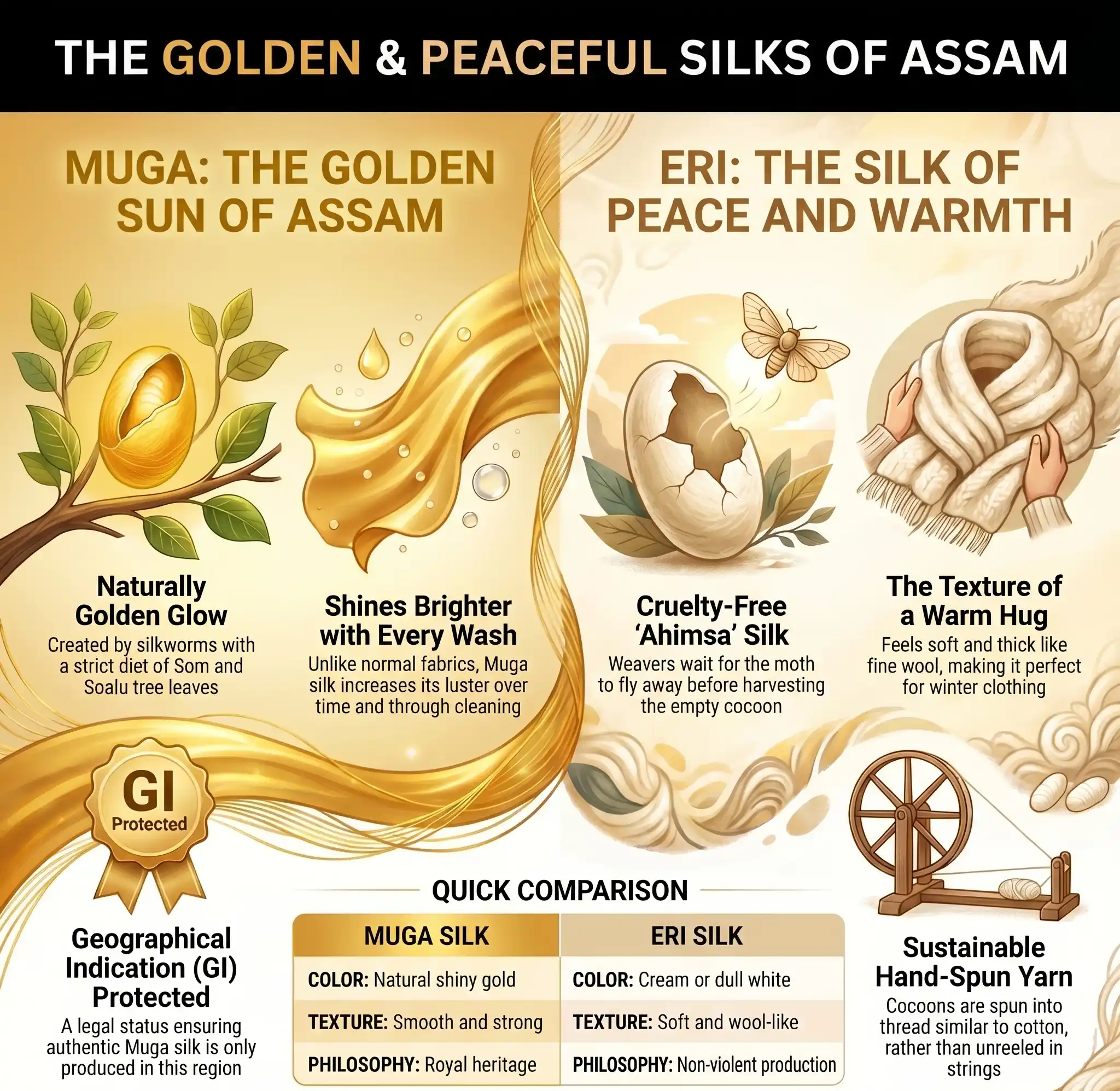 While the golden threads are famous for their shine, Eri silk is famous for its kindness. People all over the world call it Ahimsa silk, which means the silk of peace. The story of this fabric is very gentle. To make normal silk, people usually have to boil the cocoon while the little insect is still inside. But the weavers of Assam do things differently for this special type of cloth.