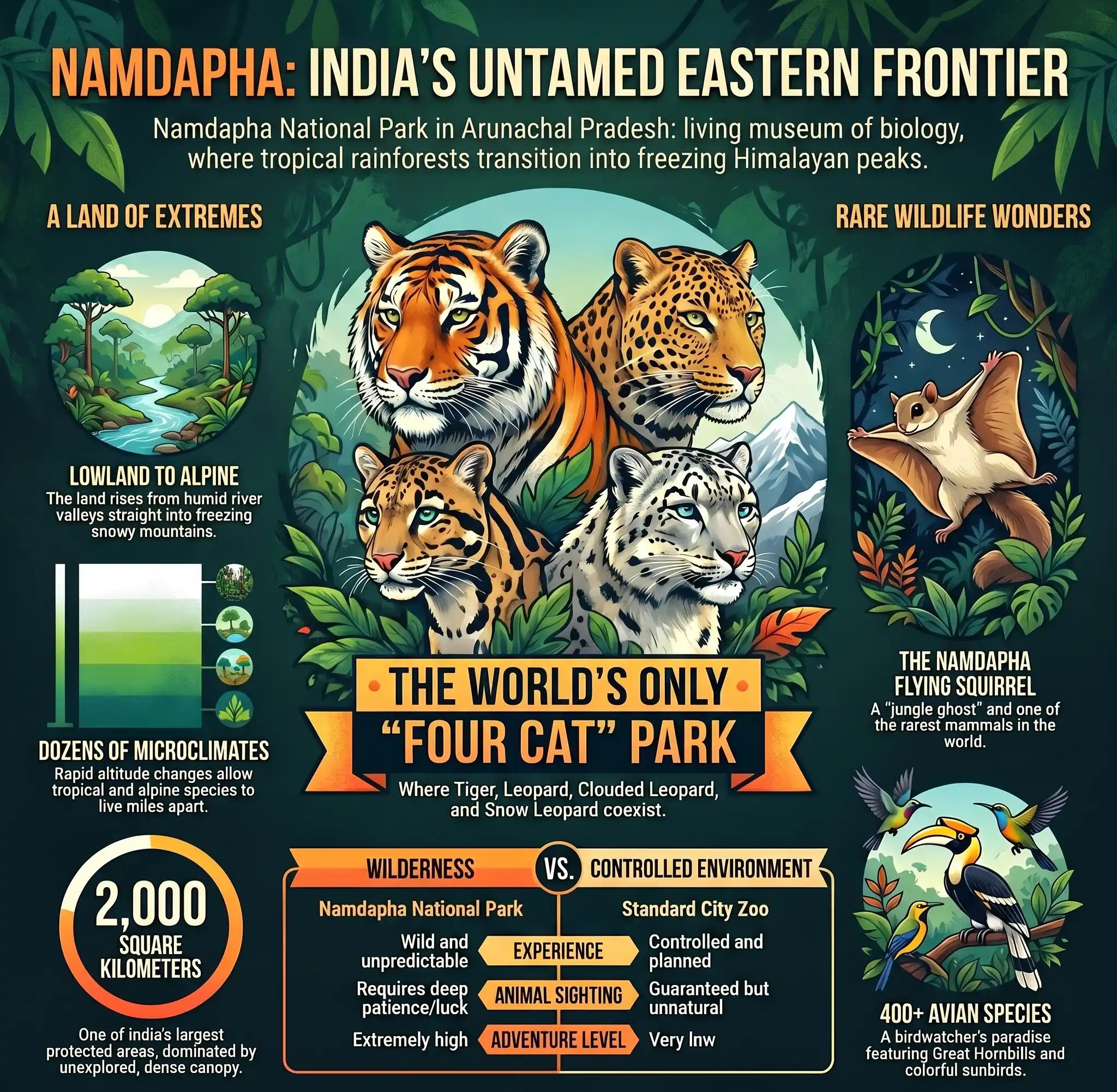 Far in the eastern corner of India lies a jungle so deep and thick that much of it remains completely unexplored. Namdapha National Park is a massive rainforest that touches the international borders of Myanmar. It is famously known as the only park in the entire world where you can find four different types of big cats living together. From steamy lowland forests to freezing snowy mountains this park is a pure paradise of nature. Local tribal communities live in harmony with rare animals like the critically endangered flying squirrel. A journey here is not just a simple wildlife safari but a real adventure into one of the last true wilderness areas on earth.| Feature | Details |