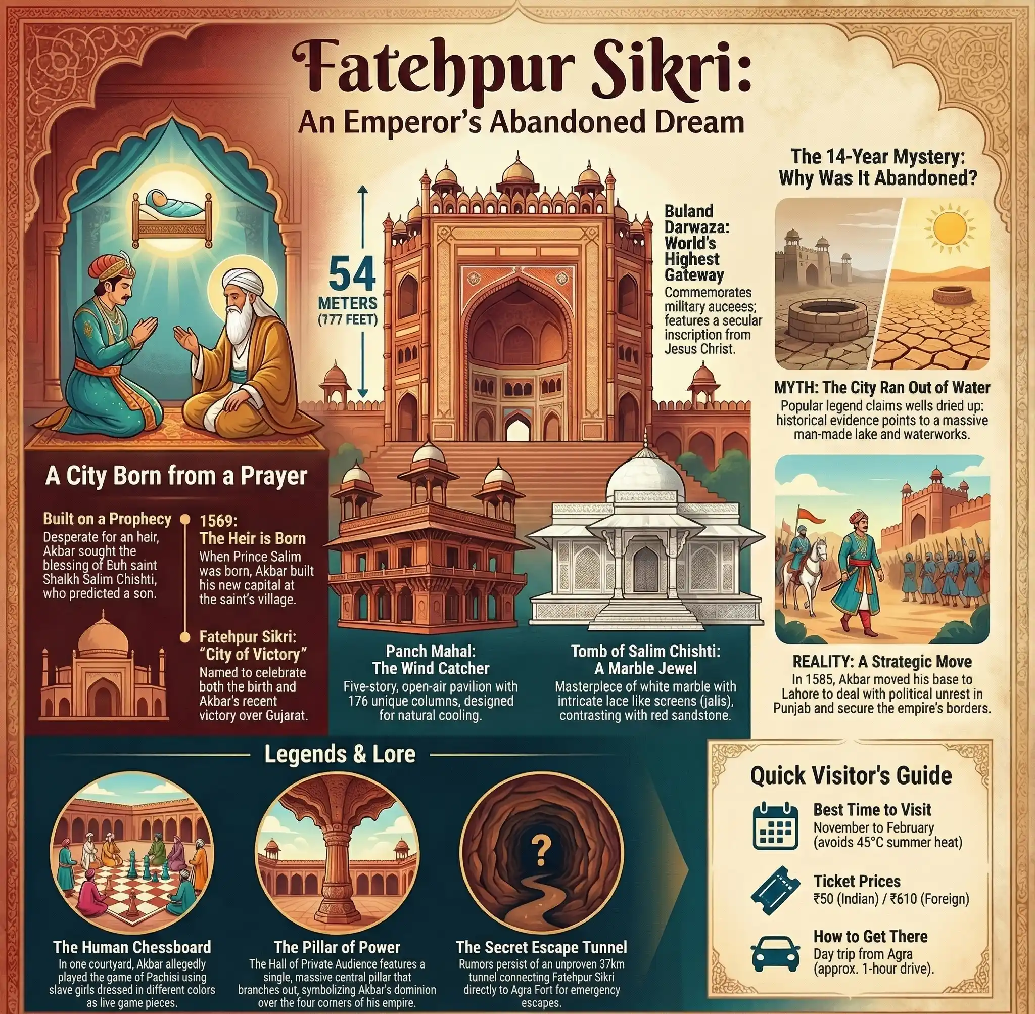 - The Political Reality: The real reason was likely strategic. Unrest in the Punjab region forced Akbar to move his base to Lahore to secure the empire’s borders. By the time he returned to the north in 1598, he settled back in Agra, leaving Fatehpur Sikri to the ghosts.