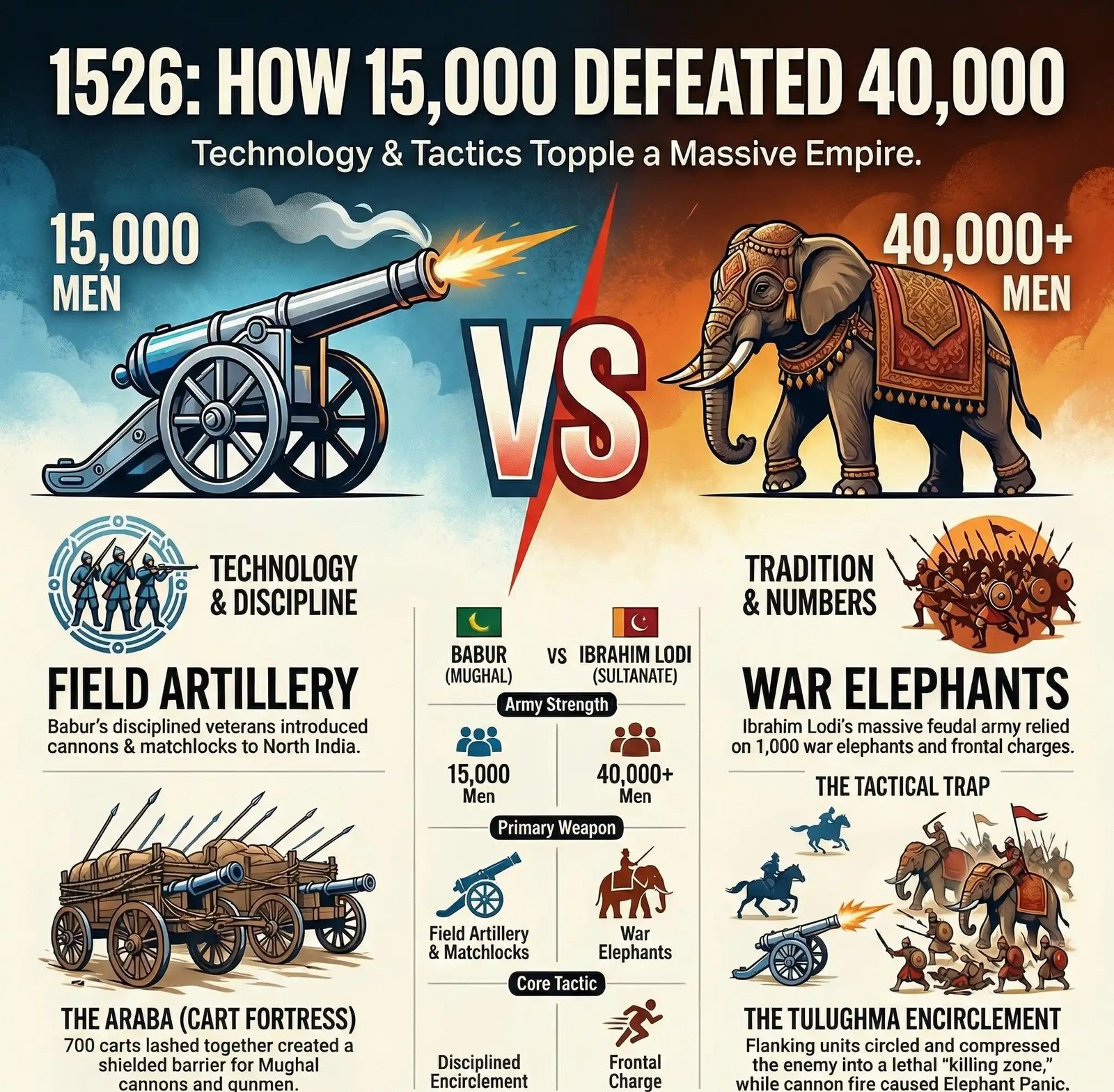 - Artillery: Babur introduced field artillery to North Indian warfare. Lodi’s army had no answer to cannons.