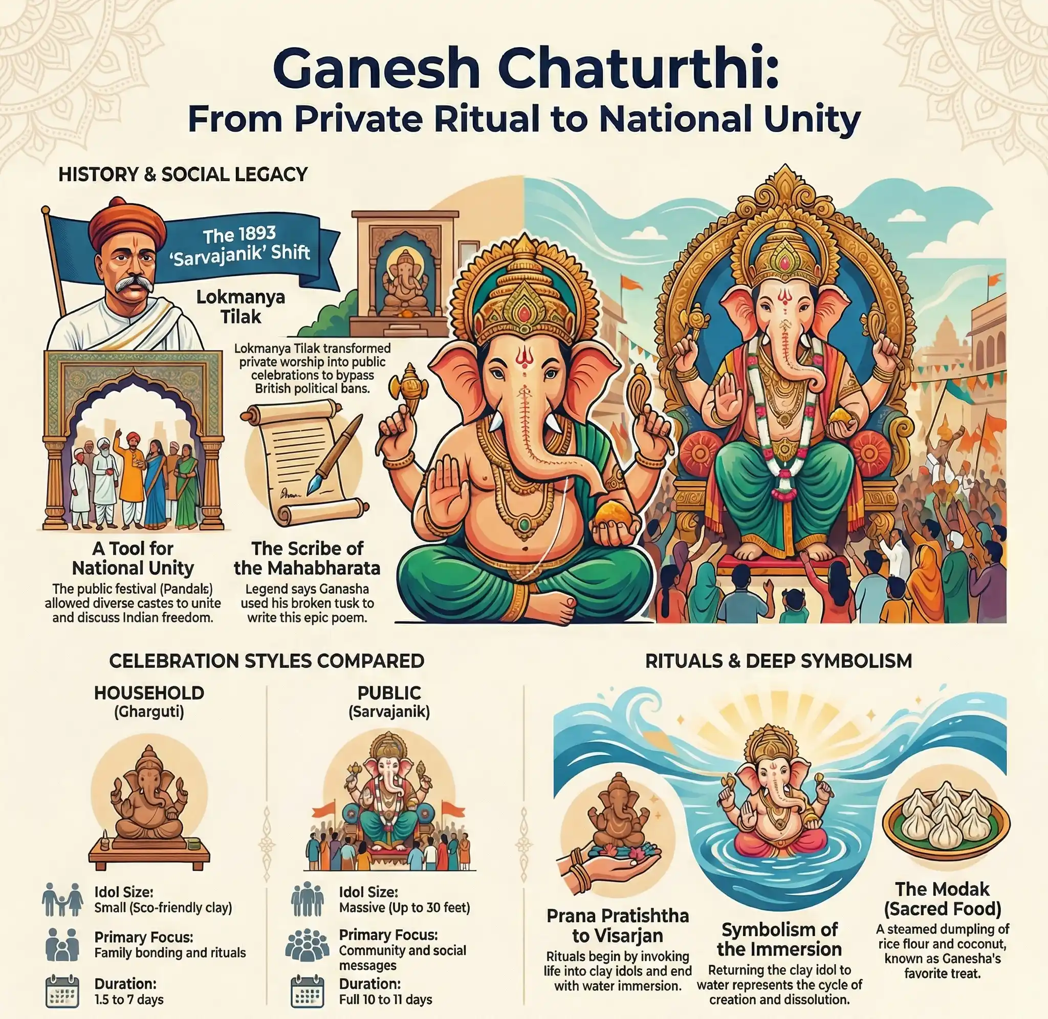 Ganesh Chaturthi (also known as Vinayaka Chaturthi) is a Hindu festival celebrating the birth of Lord Ganesha, the god of wisdom, prosperity, and new beginnings. It falls in the Hindu month of Bhadrapada (August/September). While Ganesha has been worshipped for centuries, the festival took its modern, grand public form in 1893 when freedom fighter Lokmanya Tilak transformed it from a private household ritual into a Sarvajanik (public) event to unite Indians against British colonial rule. The festival lasts for 10 days, beginning with the installation of clay idols (Prana Pratishtha) and ending with Anant Chaturdashi, when the idols are immersed in water (Visarjan), symbolizing the cycle of creation and dissolution.| Feature | Details |