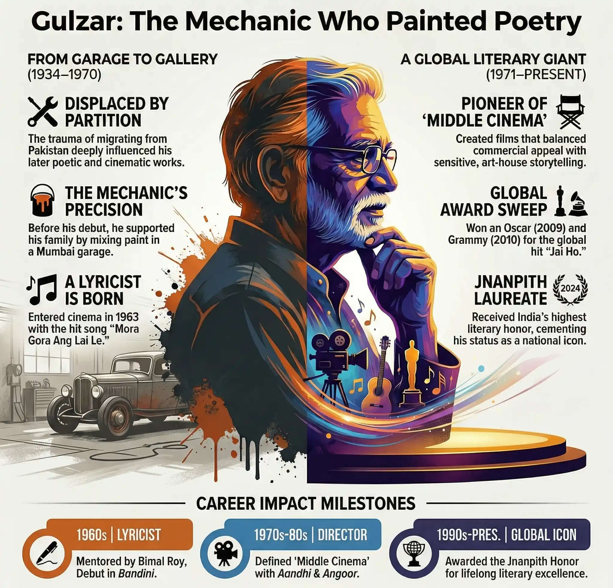 Gulzar is more than a filmmaker or a poet; he is the conscience of Indian cinema. From the dusty lanes of Dina to the red carpet of the Oscars, his journey is a narrative of resilience and quiet brilliance. He taught a nation that poetry isn’t just for textbooks—it can be found in a railway station, a rainy day, or a heartbreak. As he continues to write, Gulzar remains a timeless figure, proving that while eras change, true art remains eternal.
