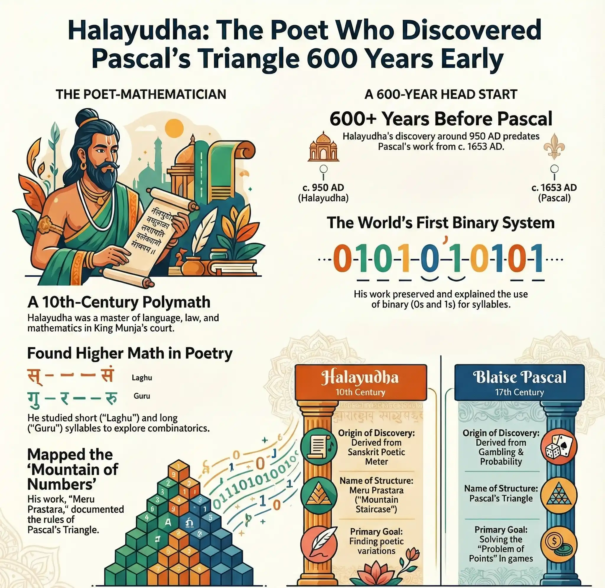 The story of Halayudha is a remarkable journey into a time when the boundaries between literature and mathematics did not exist. Living in the 10th century under the patronage of King Munja, Halayudha wrote the Mritasanjeevani, a deep commentary on ancient Sanskrit prosody. His greatest achievement was the visual and mathematical representation of the Meru Prastara, known today in the West as Pascal's Triangle. By decoding the rhythms of poetry, he provided the foundations for combinatorics and binary logic, proving that Indian thinkers were mapping the infinite long before the European Renaissance.| Feature | Details |