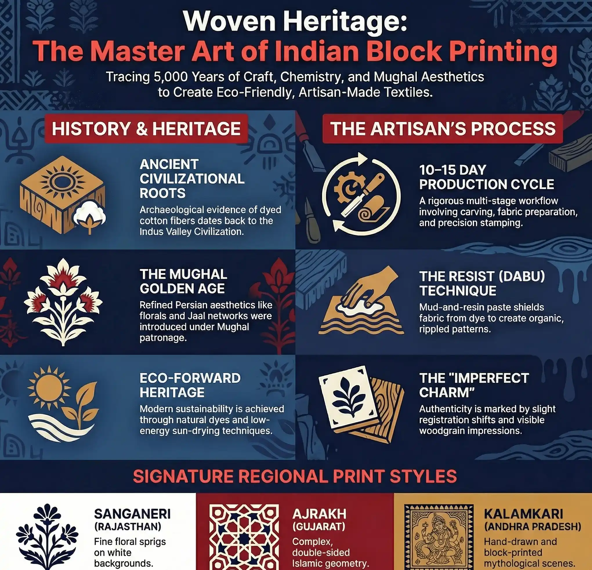 | Ajrakh | Gujarat/Kutch | Complex, double-sided Islamic geometry | Deep Indigo, Crimson Red |
