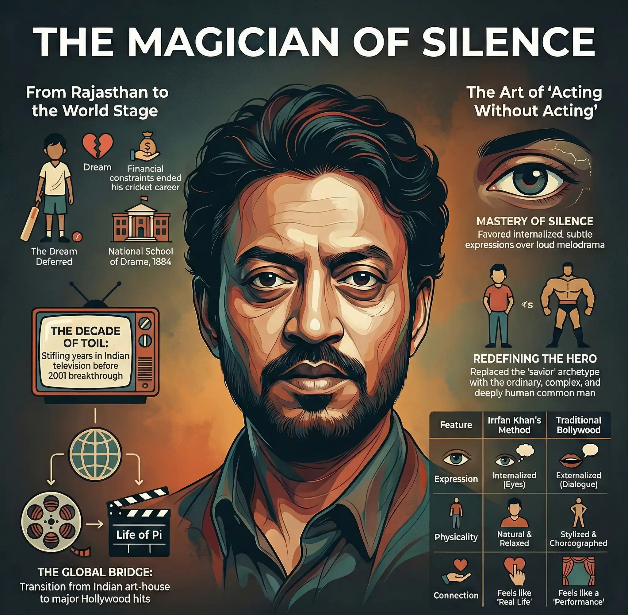 Irrfan Khan was a cinematic phenomenon who bridged the gap between the dusty realism of Indian art-house cinema and the grandeur of Hollywood blockbusters. This biography traces his evolution from a cricket-loving boy in Rajasthan to a struggling student at the National School of Drama, and finally to an international icon. We delve into his initial years of rejection, his breakthrough in films like The Warrior, and his mastery of "acting without acting." The narrative also honors his courageous battle with a neuroendocrine tumor and his untimely death, which left a void in the world of cinema that can never be filled.