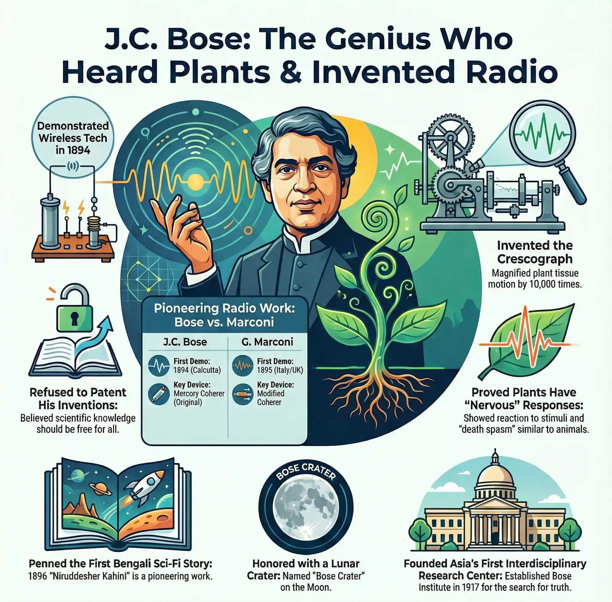 Bose invented the Mercury Coherer, a device that was essential for receiving radio signals. Interestingly, Marconi later used a slightly modified version of this very coherer to receive the first transatlantic radio signal in 1901. Why then is Marconi the household name while Bose remained in the shadows? The answer lies in Bose’s philosophy. He was deeply averse to patenting his inventions. He believed that scientific knowledge should be free for the benefit of all humanity. While others saw profit, Bose saw progress. This refusal to commercialize his genius is why the father of radio science tag remained largely unacknowledged by the West for nearly a century.