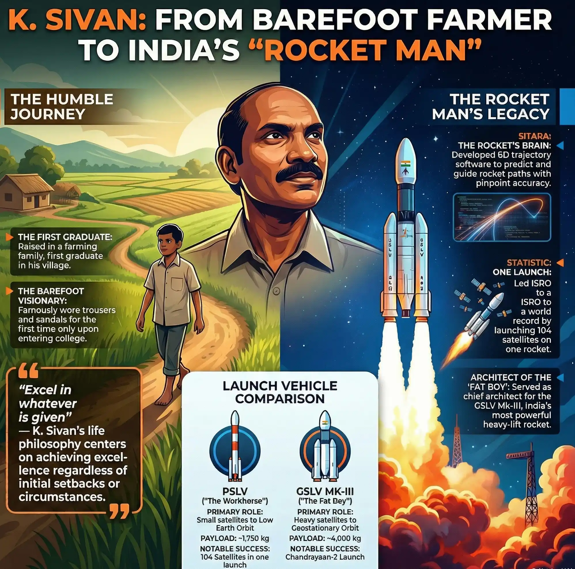 Dr. K. Sivan is the embodiment of the great Indian dream. His life proves that it doesn’t matter if you start your journey walking barefoot through a village, as long as you keep your eyes fixed on the sky. He taught a nation that in science, there are no absolute failures—only data points for the next, better attempt. Through his brilliant trajectory software, his heavy-lift rockets, and his deeply human leadership, the “Rocket Man” ensured that India’s space program will soar for generations to come.