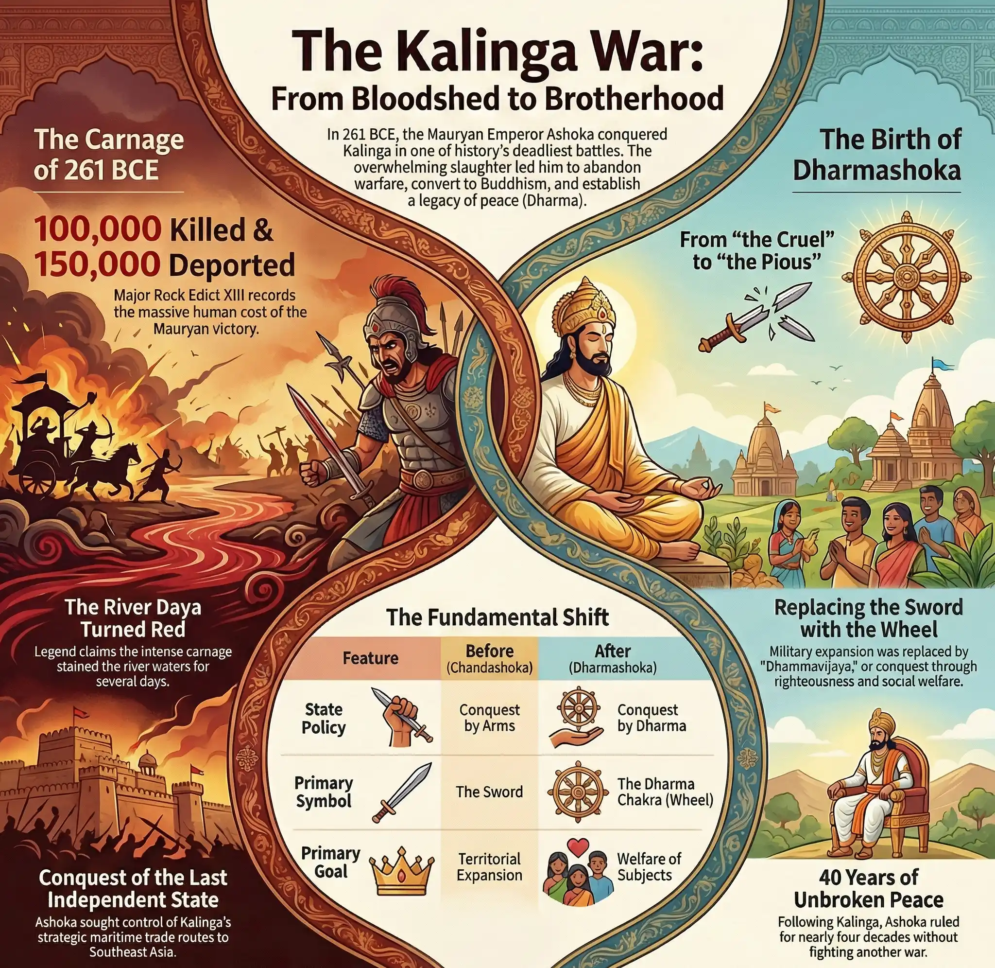 The Kalinga War is perhaps the only instance in history where a victor abandoned warfare immediately after his greatest victory. It proved that while force can conquer land, only remorse and righteousness can conquer hearts. Ashoka’s legacy of non-violence, born from the blood of Kalinga, continues to influence India, symbolized by the Ashoka Chakra on the Indian flag.