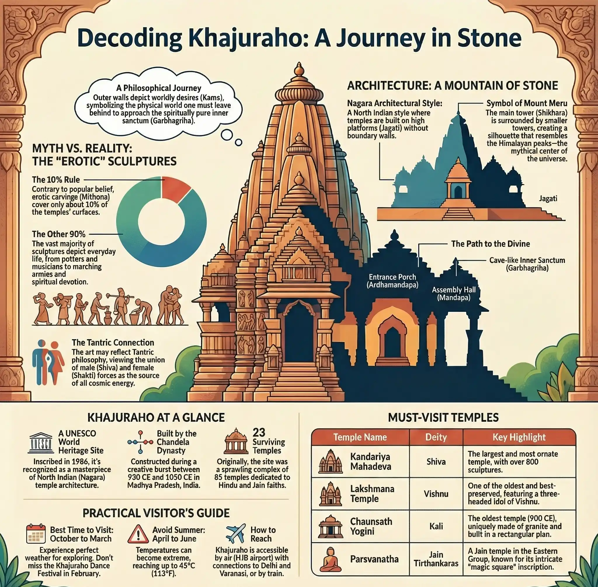 The most common question about Khajuraho is: Why are there erotic carvings on a holy temple? To understand this, we must look past modern morality and into ancient philosophy.