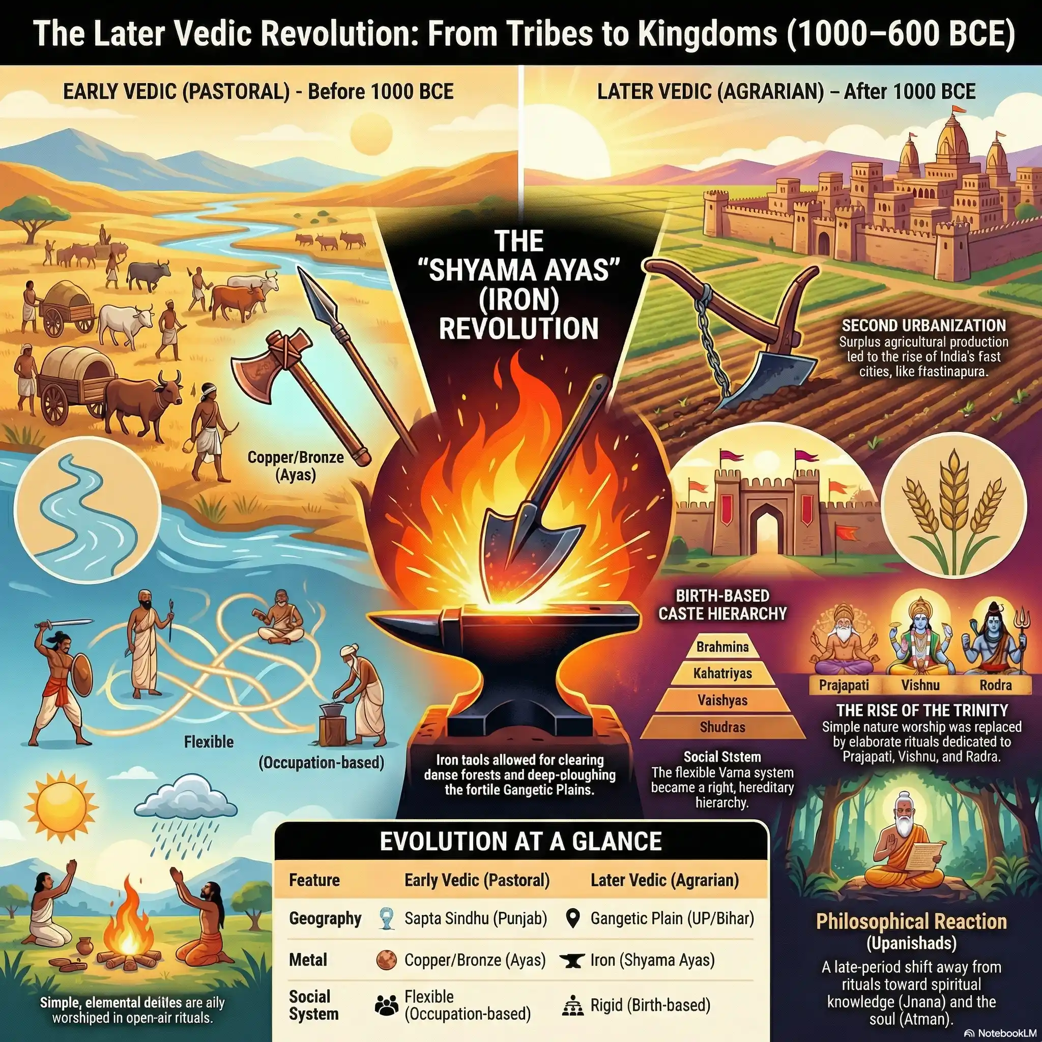 The Later Vedic Period (c. 1000–600 BCE) marks a decisive shift in Indian history. Unlike the nomadic, cattle-rearing society of the Early Vedic Age, this era saw the Aryans expand eastward from the Sapta Sindhu region into the fertile Gangetic Plains (Western UP, Delhi, Haryana). This expansion was driven by the discovery of Iron (Shyama Ayas), which allowed for the clearing of dense forests and the use of deep-ploughing agriculture. Political life transitioned from tribal assemblies to territorial kingdoms called Janapadas. The simple nature worship of the Rigveda gave way to elaborate rituals, the rise of the Prajapati-Vishnu-Rudra trinity, and the rigidification of the Varna system into a birth-based caste hierarchy.| Feature | Details |