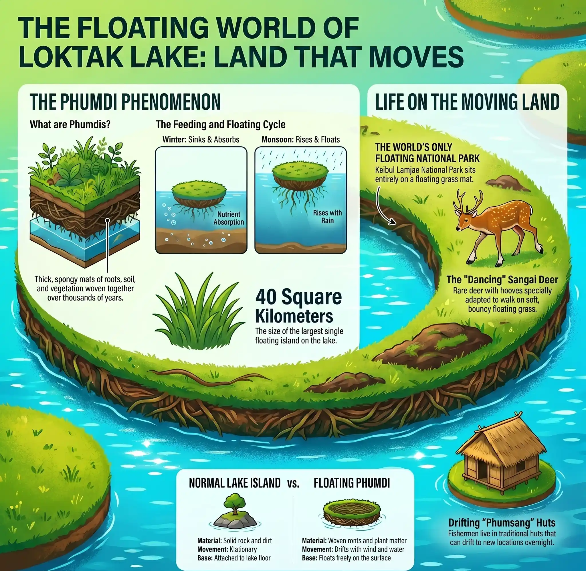 In the peaceful valleys of Manipur lies a massive body of water that completely defies the normal rules of nature. It is known as Loktak Lake and it is famous for its large circular green islands that actually float on the water. These unique islands are called phumdis. They are not made of solid rock but are thick mats of grass soil and organic matter that have woven together over thousands of years. For the local fishermen these floating patches are a true home where they build small wooden huts and catch fresh fish daily. The lake is also the only home in the entire world to the rare sangai deer which literally dances on the soft floating grass. This beautiful relationship between human beings, wild animals and moving land makes it a true national treasure.| Feature | Details |