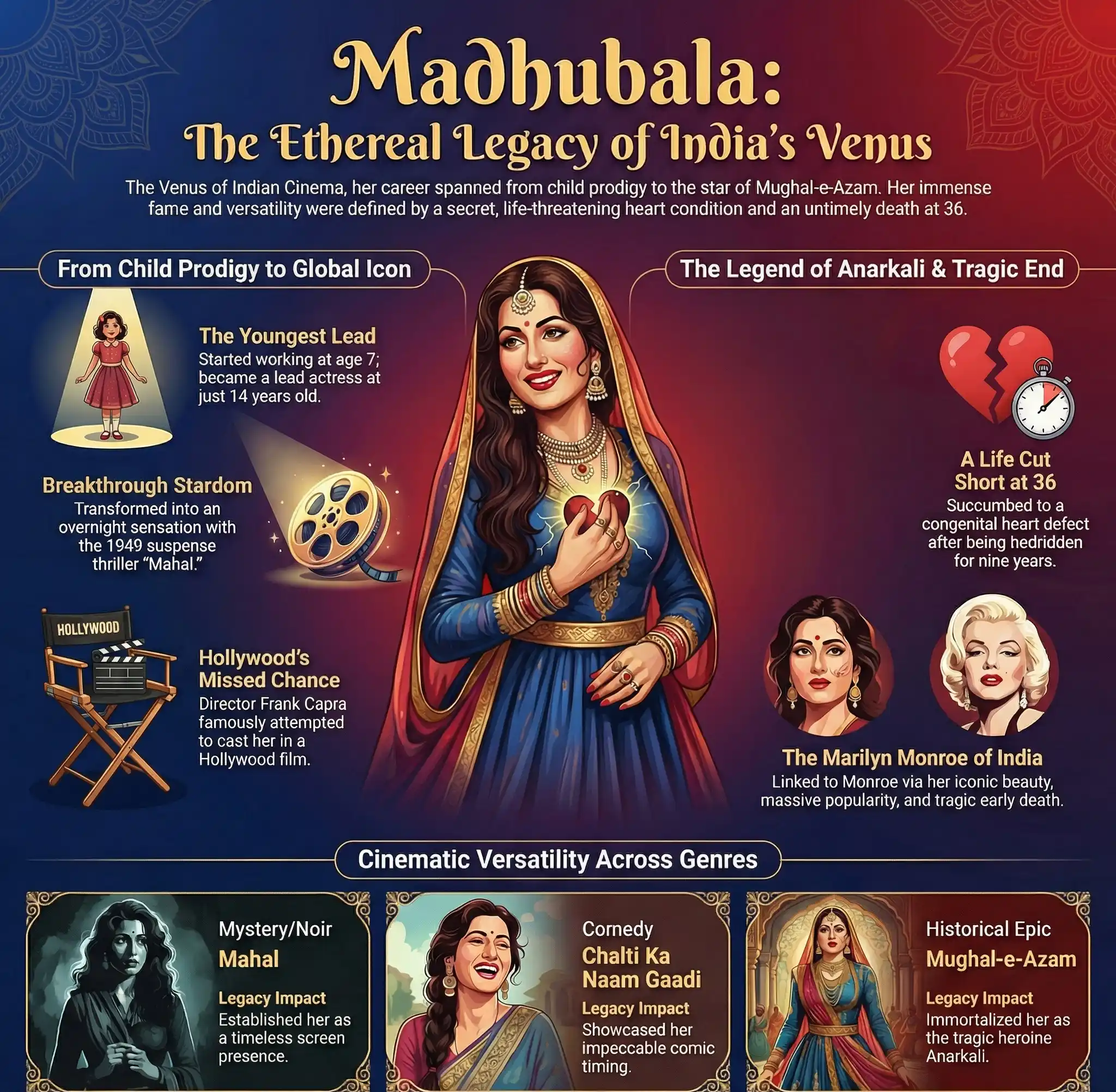 Madhubala was more than just a beautiful face; she was a force of nature whose brilliance burned too bright, too fast. Her life was a poignant mix of cinematic glory and personal tragedy. Even decades after her death, her smile in Chalti Ka Naam Gaadi and her defiant gaze in Mughal-e-Azam continue to haunt and heal millions of fans. She remains, in every sense, the eternal Anarkali of Indian cinema.