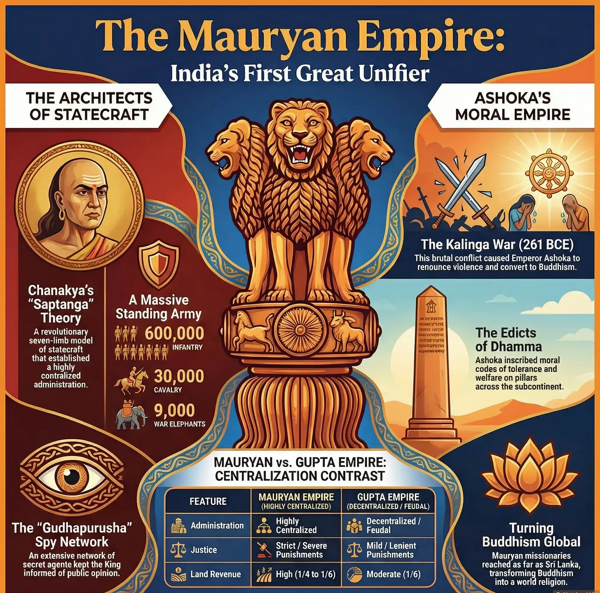The Mauryan Empire was a political experiment that succeeded beyond measure. It gave India its first unified identity, its first major road networks, and a legacy of administrative statecraft that is still studied today. While the empire fell, symbols like the Ashoka Chakra and the Lion Capital ensure that the Mauryan legacy lives on in the heart of modern India.