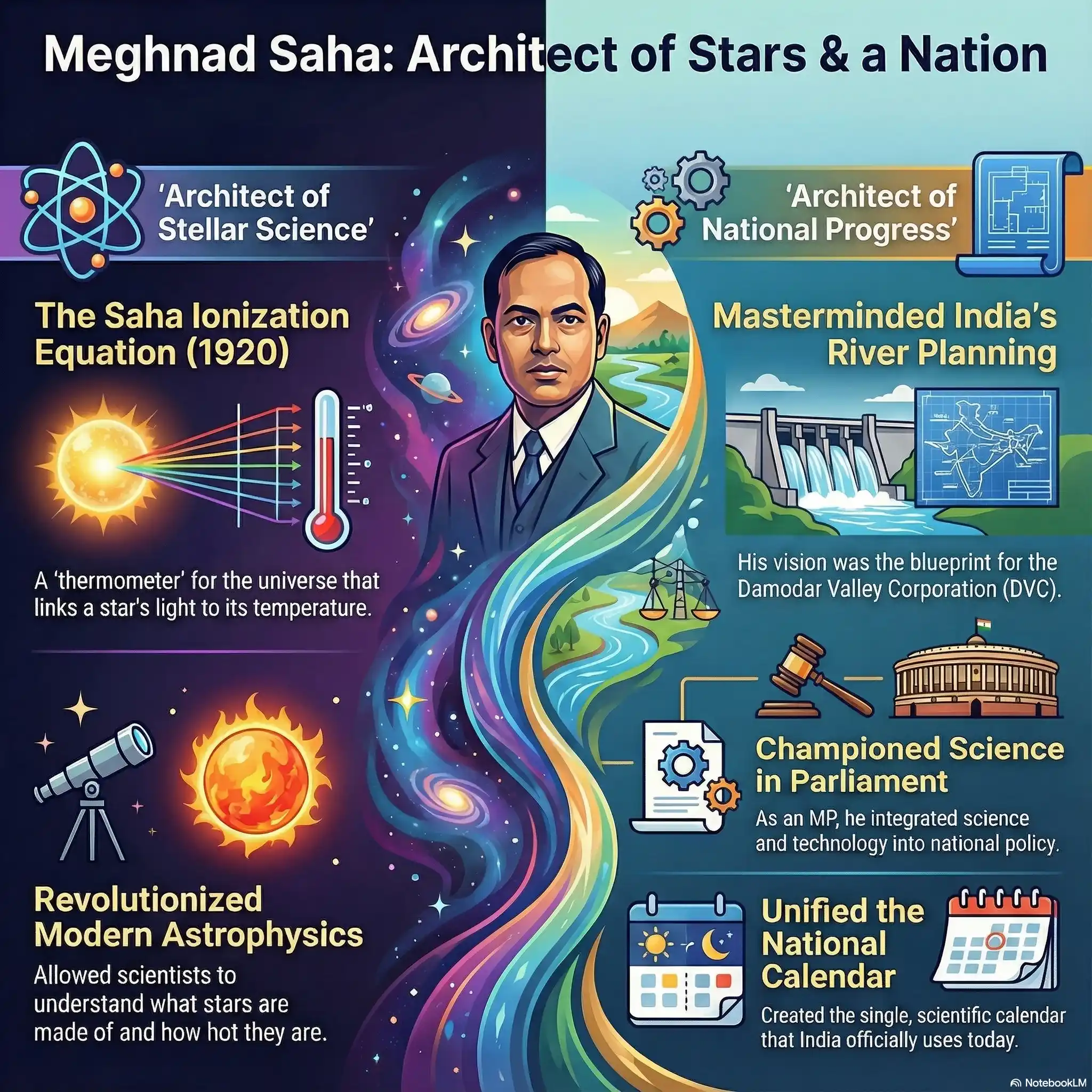 The Meghnad Saha life and achievements tell the incredible story of a village boy who overcame systemic poverty and caste barriers to become a global titan of astrophysics. By formulating the Saha Ionization Equation, he provided the key to understanding stellar atmospheres, revolutionizing modern astronomy. Beyond his academic brilliance, Saha was a dedicated nation-builder who spearheaded river planning in India, founded the DVC, served as a Member of Parliament, and unified the Indian National Calendar. His life remains a perfect blend of scientific excellence and unwavering social commitment.