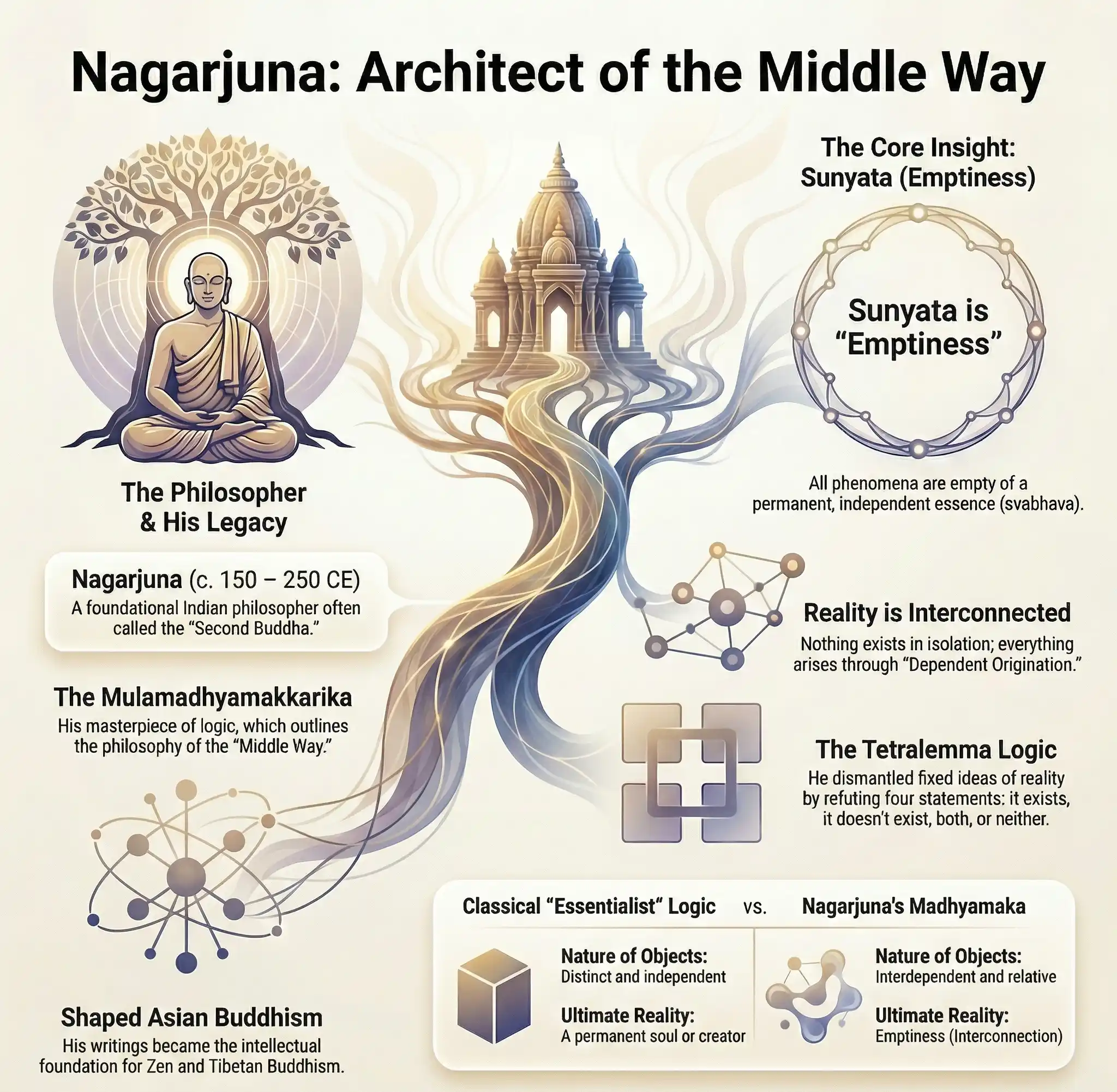| Feature | Classical “Essentialist” Logic | Nagarjuna’s Madhyamaka |