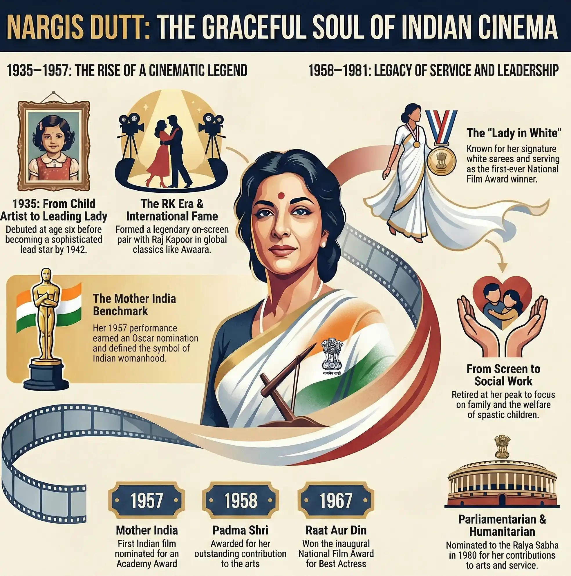 Nargis, born Fatima Rashid in 1929, was one of the greatest actresses in Indian cinema history. Making her screen debut as a child artist, she rose to fame in the late 1940s and 50s, forming a legendary on-screen pair with Raj Kapoor in classics like Awaara and Shree 420. Her career defined the golden era of Bollywood, culminating in her magnum opus, Mother India (1957), which earned an Academy Award nomination. After marrying her co-star Sunil Dutt, she retired from films to focus on family and social work, becoming the first patron of The Spastic Society of India. Her life was cut short by pancreatic cancer in 1981, leaving behind a legacy of artistic excellence and humanitarian service.| Attribute | Details |