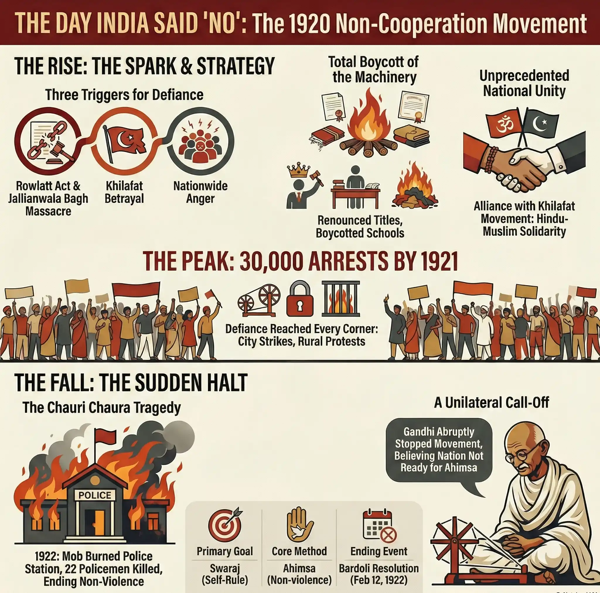 The Non-Cooperation Movement (1920–1922) was the first nationwide mass movement launched by Mahatma Gandhi and the Indian National Congress. Triggered by the Jallianwala Bagh Massacre, the repressive Rowlatt Act, and the Khilafat issue, the movement aimed to attain Swaraj (Self-Rule) within one year. It marked a radical shift in the freedom struggle, moving from elite boardrooms to the streets. Students boycotted schools, lawyers gave up their practice, and bonfires of foreign cloth were lit across the country. The movement saw unprecedented Hindu-Muslim unity but was abruptly called off by Gandhi in February 1922 after the violent Chauri Chaura incident, where a mob burnt a police station, killing 22 policemen.| Feature | Details |