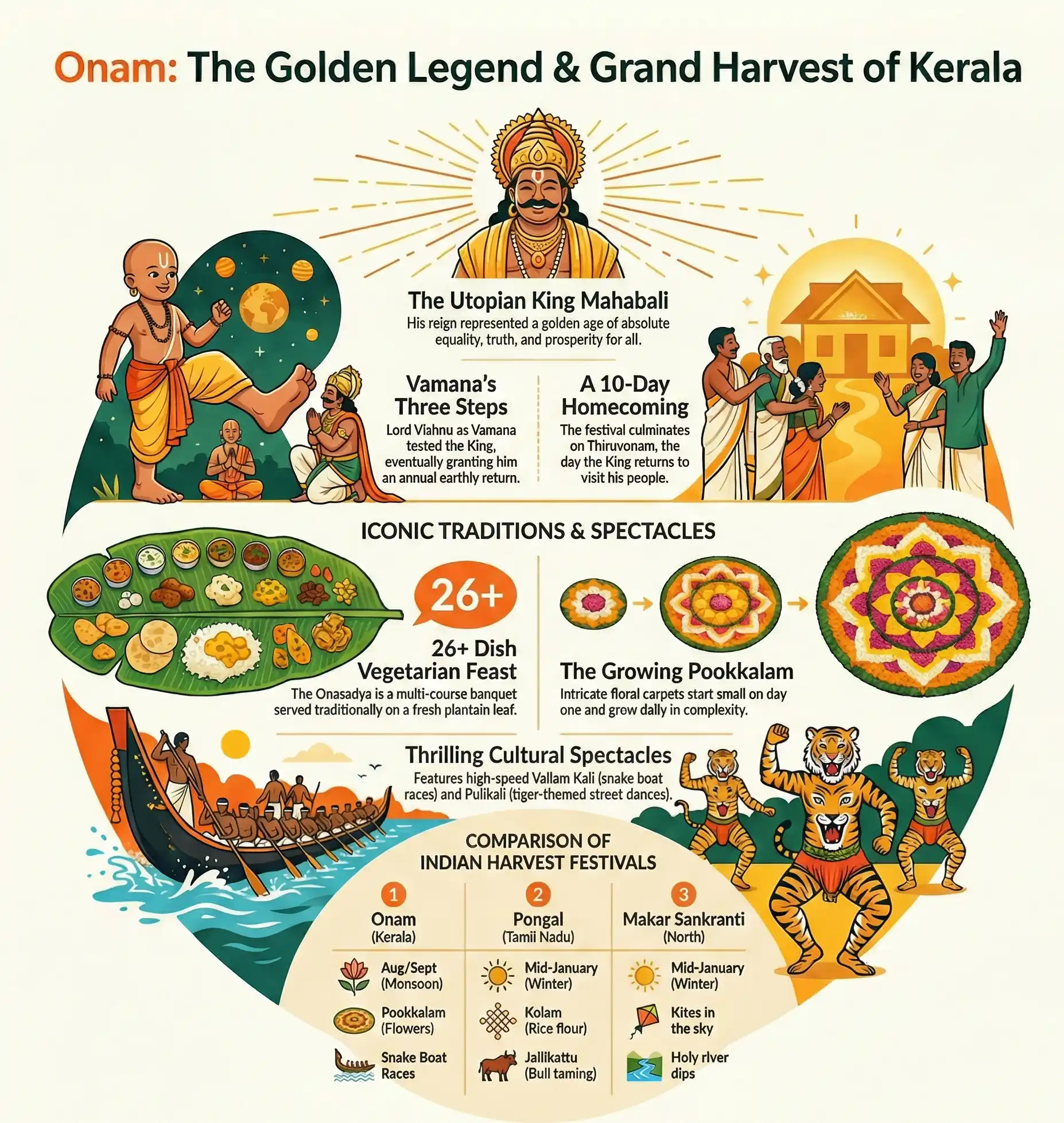 Onam is the official state festival of Kerala, celebrated with immense fervor during the Malayalam month of Chingam (August–September). Spanning ten days, it is a harvest festival that commemorates the annual homecoming of the mythical and righteous Asura King, Mahabali (Maveli). Though rooted in Hindu mythology, Onam is uniquely secular, celebrated by Malayalis across all religions. The festival is marked by vibrant Pookkalam (floral carpets), the thrilling Vallam Kali (snake boat races), traditional folk dances like Pulikali (tiger dance), and the ultimate culinary experience—the 26-dish vegetarian feast known as Onasadya, served on a plantain leaf.| Feature | Details |