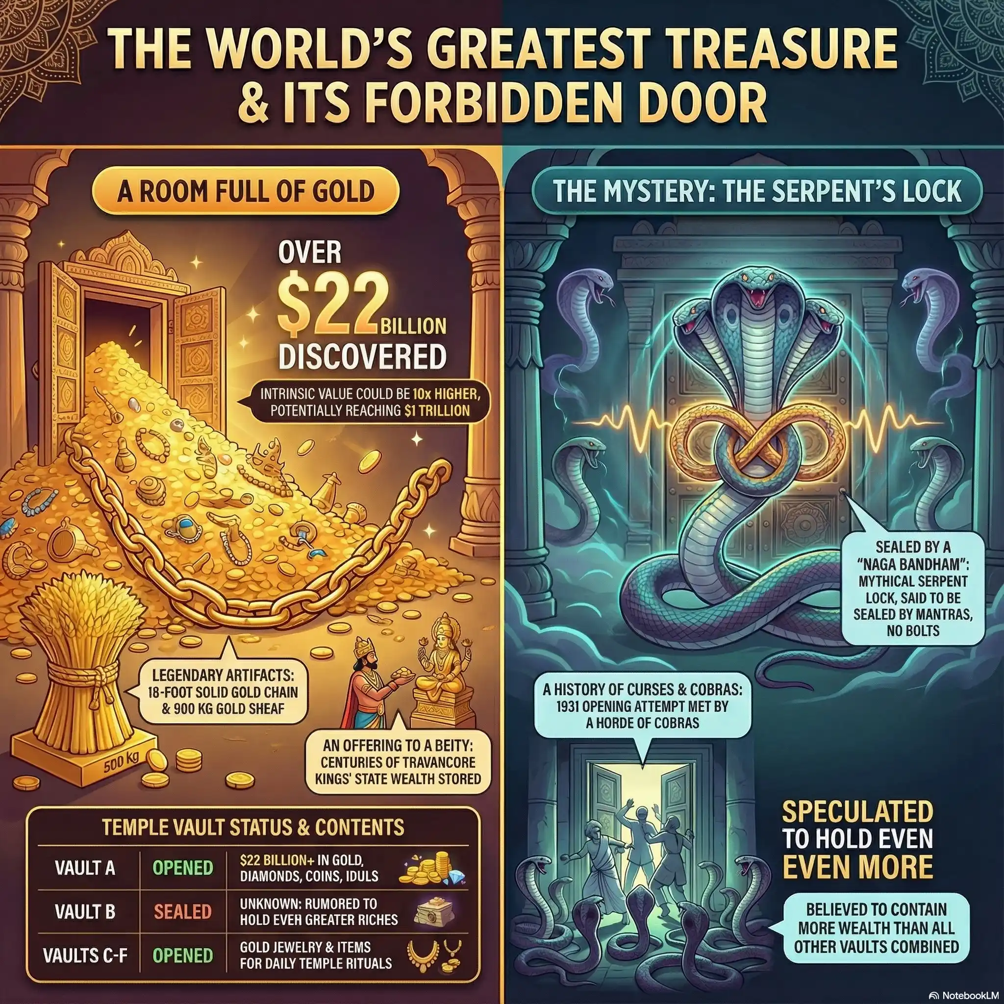 The Padmanabhaswamy Temple Treasure represents the largest discovery of hidden wealth in human history, located in Thiruvananthapuram, India. While five of the six underground vaults have been opened, revealing billions of dollars in gold and jewels, the mysterious Vault B remains sealed. Protected by legends of divine curses and ancient spells, this "richest temple in the world" continues to captivate the world with its blend of historical reality and supernatural mystery.| Feature | Details |