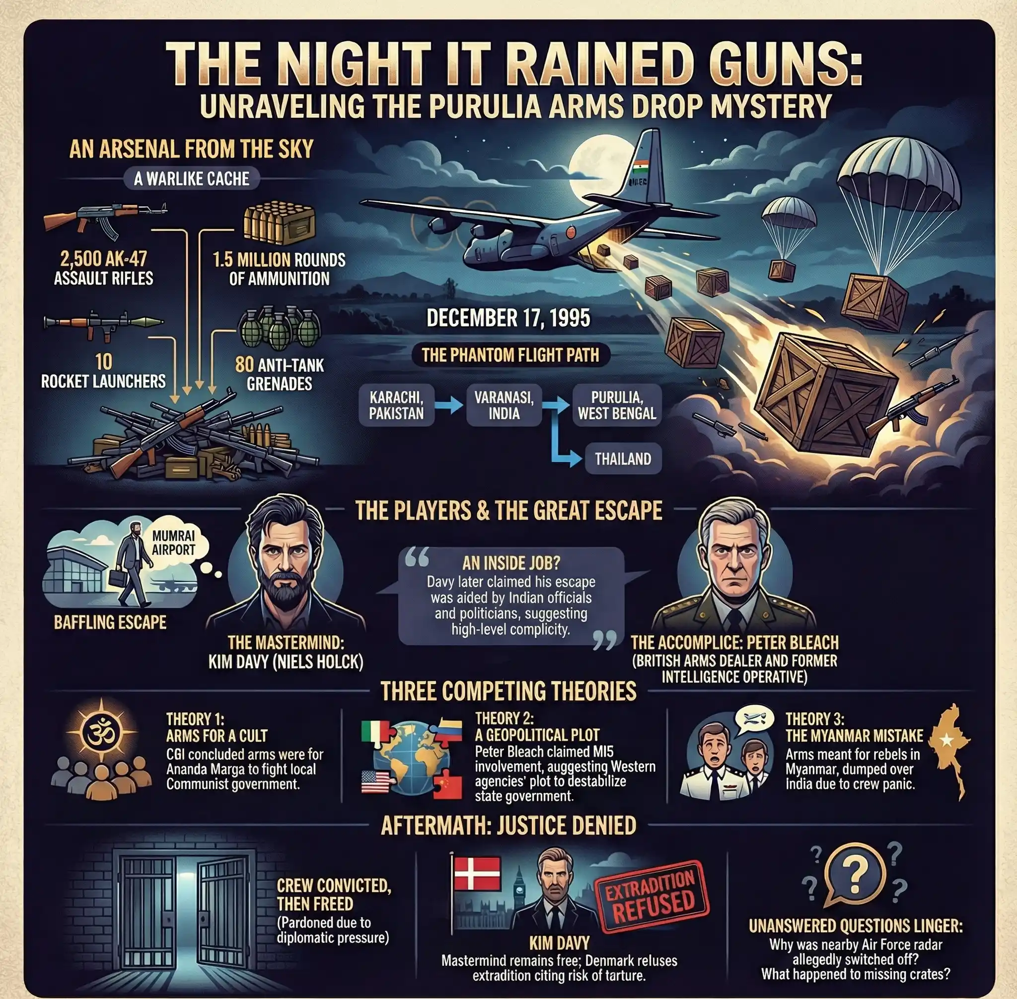 Unpacking the Purulia arms drop mystery of 1995. Why did a foreign plane drop thousands of AK-47s over a Bengal village? Was it a coup attempt, a CIA plot, or a mistake? We investigate.