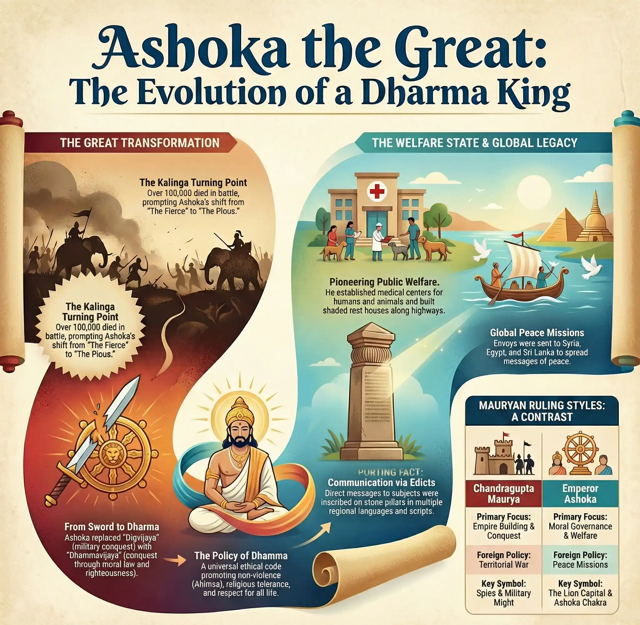 The Kalinga War (261 BCE) changed his life, leading him to embrace non-violence.