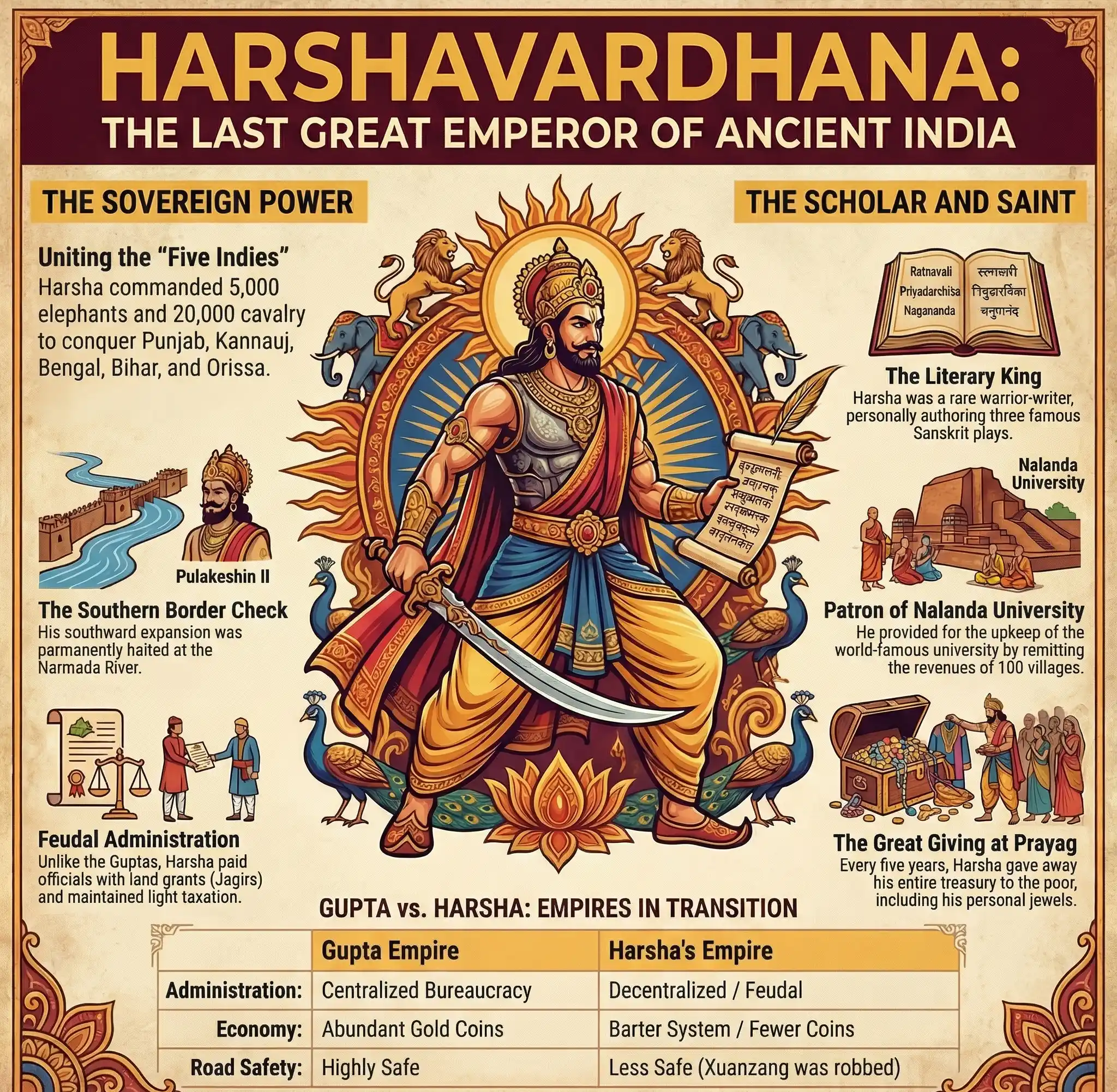 - No Heir: Despite his greatness, Harsha died without an heir (his children were reportedly killed or died young). His empire disintegrated immediately after his death, plunging North India into anarchy until the rise of the Pratiharas.