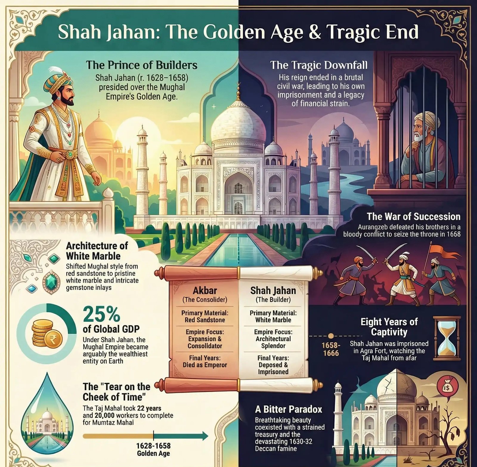 The Reign of Shah Jahan (1628–1658) is often called the “Golden Age” of the Mughal Empire. Born as Prince Khurram, he ascended the throne after a succession struggle in 1628. His rule is synonymous with architectural grandeur; he commissioned world-famous monuments like the Taj Mahal, the Red Fort (Lal Qila), and the Jama Masjid. Militarily, he expanded the empire into the Deccan, annexing Ahmednagar and forcing Bijapur and Golconda into submission. However, his heavy spending on monuments and wars strained the treasury. His reign ended tragically in 1658 when his son, Aurangzeb, defeated his other sons in a bloody War of Succession and imprisoned Shah Jahan in the Agra Fort for the final eight years of his life.