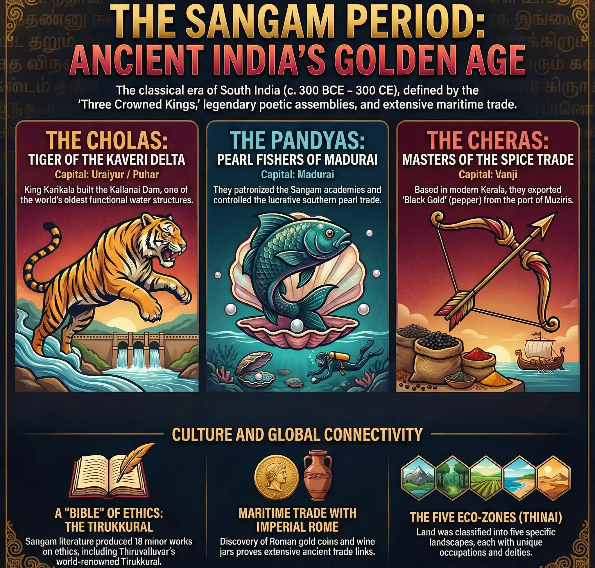 The Sangam Period was a time of immense creativity and prosperity. It laid the cultural and linguistic foundation for South India. The literature produced during this era remains the primary source for understanding ancient Tamil life, proving that 2,000 years ago, Tamilakam was a highly civilized, urban, and globally connected society.