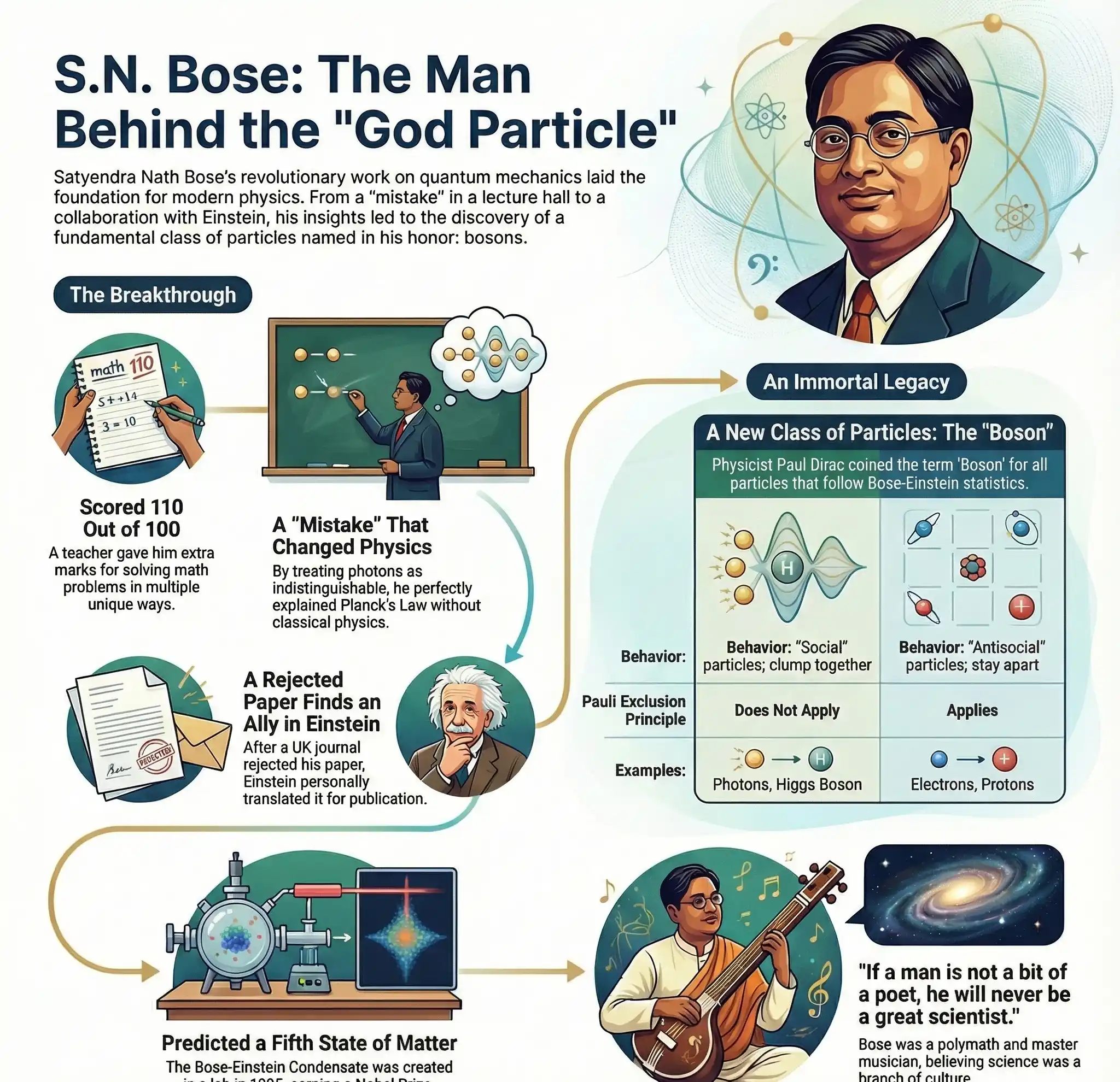The life of Satyendra Nath Bose is a saga of intellectual defiance and profound discovery. From being a record-breaking student in Calcutta to becoming a global collaborator with Albert Einstein, Bose transformed our understanding of the subatomic world. By treating particles as indistinguishable entities, he laid the groundwork for the Bose-Einstein Statistics and the discovery of bosons. Despite never winning a Nobel Prize, his legacy is etched into the very name of the fundamental particles that make up our universe, proving that Indian scientific prowess is second to none.| Attribute | Details |