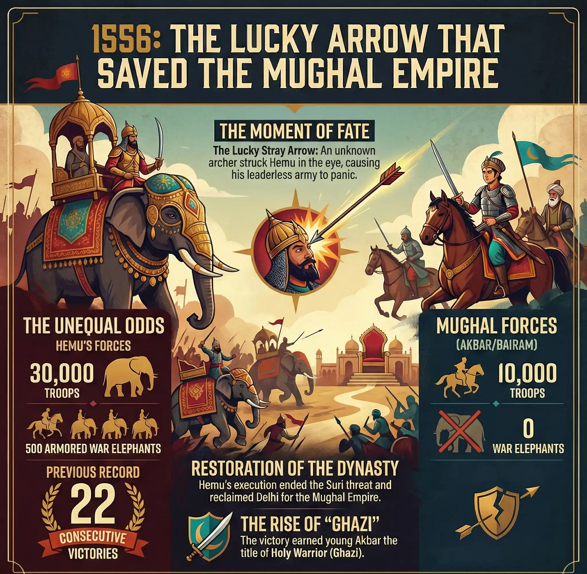 By mid-day, Hemu was on the verge of victory. His elephants had broken the Mughal wings. Then, fate intervened. A stray arrow, fired by an unknown Mughal archer, struck Hemu in the eye. The arrow pierced his brain, and he collapsed unconscious in his howdah.