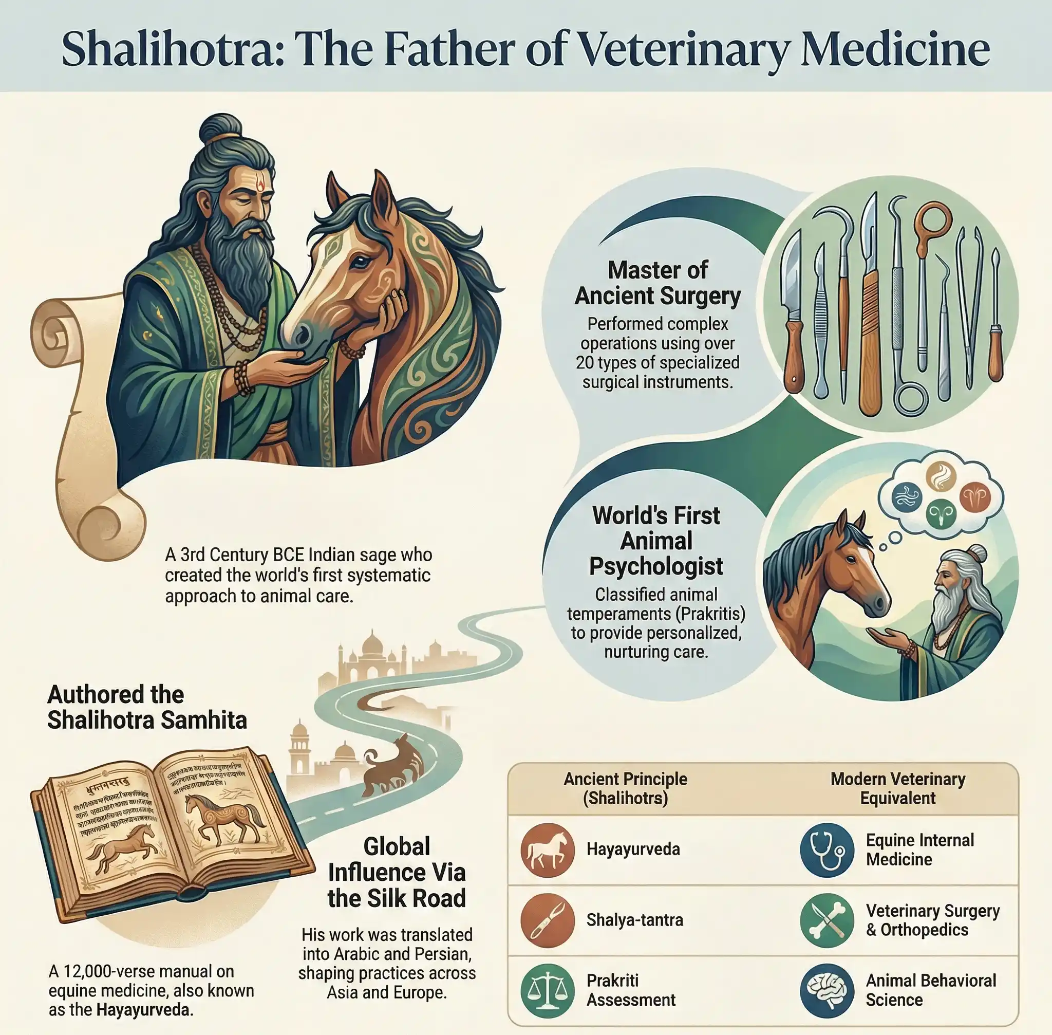 Shalihotra was a pioneering Indian sage of the 3rd Century BCE who earned the title of Father of Veterinary Medicine by creating the world's first scientific system for animal care. His monumental work, the Shalihotra Samhita, provided a comprehensive guide to equine anatomy, surgery, and psychology, blending spiritual compassion with rigorous clinical observation. His teachings traveled across the Silk Road, influencing medical traditions worldwide and establishing ancient India as the cradle of veterinary science.| Data Point | Historical Detail |