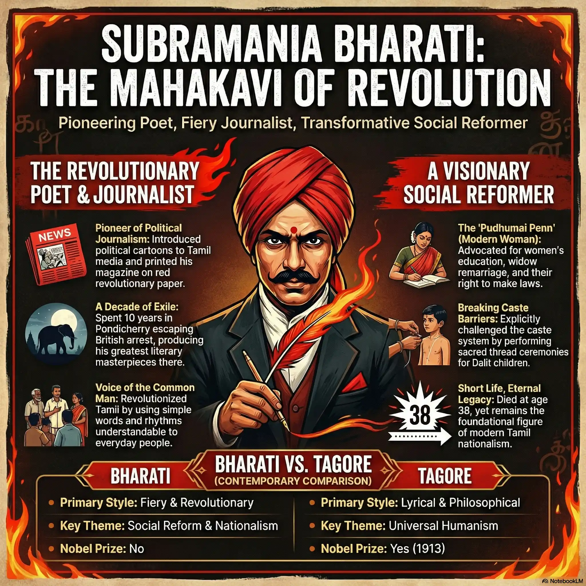 Subramania Bharati (1882–1921), popularly known as Mahakavi Bharathiyar, was a Tamil writer, poet, journalist, and Indian independence activist. Born in Ettayapuram, he was a prodigy who earned the title "Bharati" (Blessed by Saraswati) at age 11. He was a pioneer of modern Tamil poetry, introducing a new style called Puthukavithai (Free Verse). As a journalist, he edited magazines like India and Swadesamitran, using cartoons and fiery editorials to attack British rule. Forced into exile in Pondicherry (then under French rule) for 10 years, he produced his greatest literary works there, including Kuyil Pattu, Kannan Pattu, and Panchali Sabatham. He was not just a nationalist but a social reformer who fought against the caste system and advocated for women's liberation.| Feature | Details |