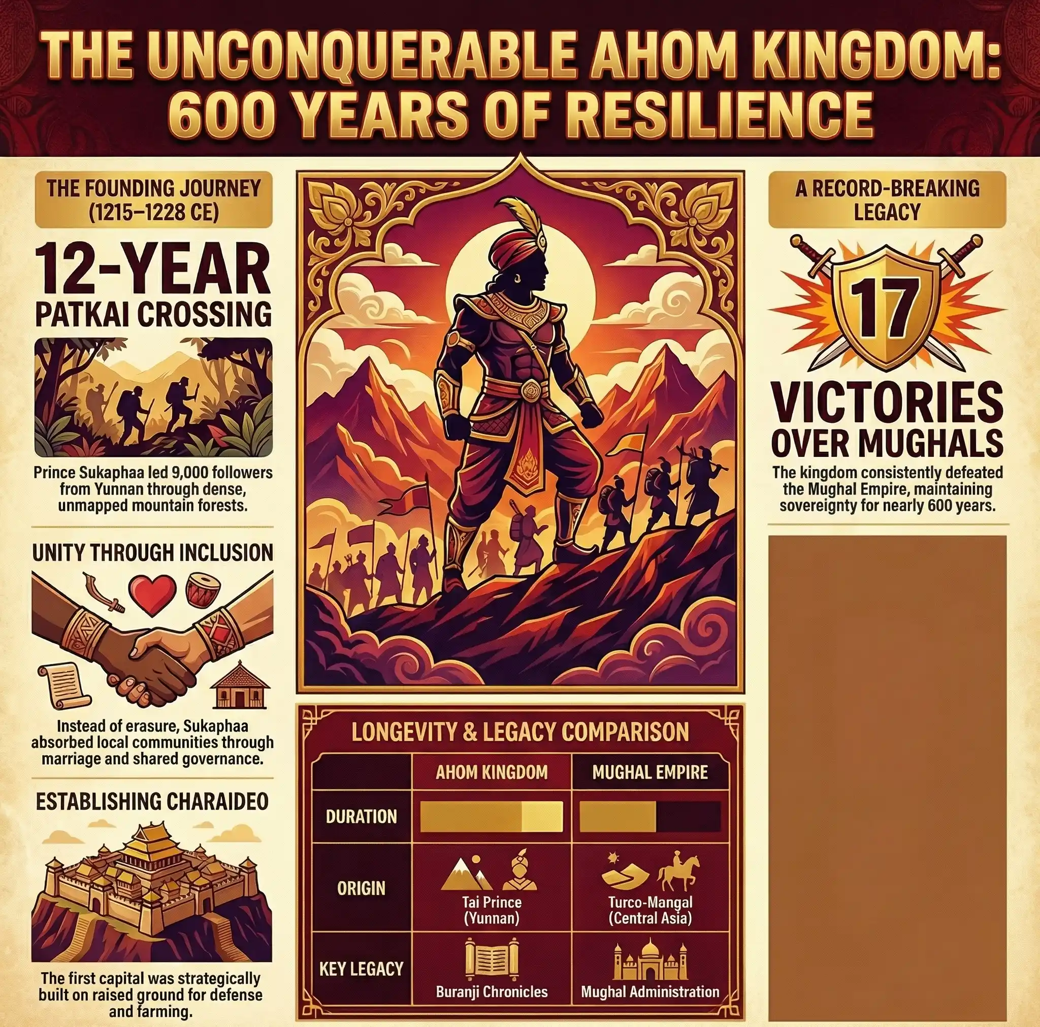 In 1228 CE, a Tai prince called Chaolung Sukaphaa led a group of followers across the Patkai mountain range from the region of Mong Mao in present-day Yunnan, China. After a journey of twelve years through dense forests and difficult hills, he arrived in the Brahmaputra Valley and established what would become the Ahom Kingdom. For the next six hundred years, the Ahom dynasty ruled over most of Assam without ever being permanently conquered. They defeated the mighty Mughal Empire seventeen times. They absorbed dozens of different peoples and communities into one shared identity. They built a system of governance, record keeping, and public works that was centuries ahead of its time. The story of how it all started with one man's crossing of a mountain range is one of the greatest founding stories in Indian history.