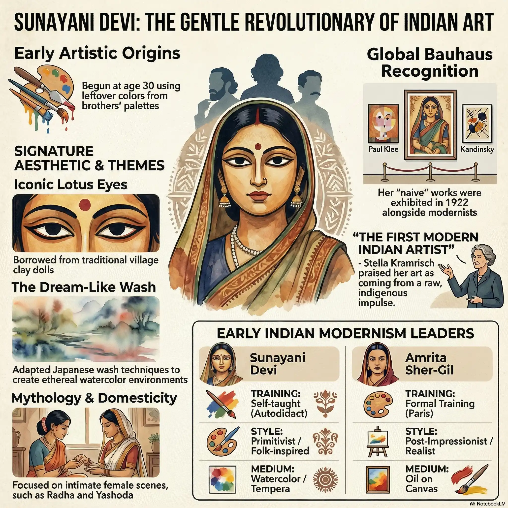 Sunayani Devi (1875–1962) was a pioneering Indian artist and a member of the illustrious Tagore family. The younger sister of Abanindranath and Gaganendranath Tagore, she is often cited as the first modern woman painter of India. Unlike her brothers, she received no formal training. She began painting at the age of 30, developing a unique, self-taught style that critics later termed "Naive" or "Primitivist." Drawing inspiration from Kalighat Pat paintings and Indian folk dolls, her works are characterized by elongated eyes, soft wash techniques, and mythological themes centered on women. Despite being overshadowed by her male relatives, her work was highly acclaimed by art critics like Stella Kramrisch and was even exhibited by the Bauhaus in 1922.