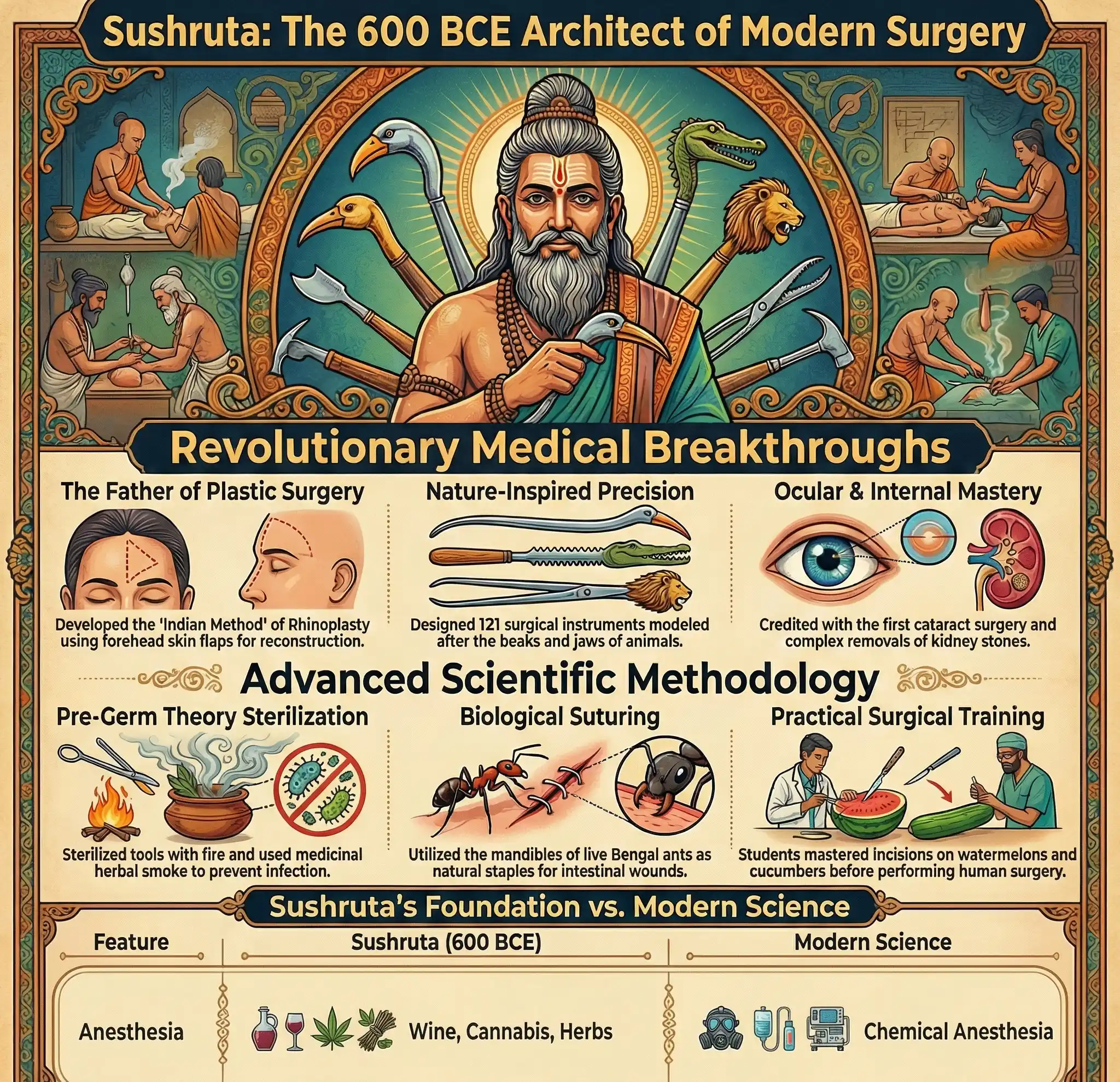 Imagine walking through the bustling streets of ancient Kashi in 600 BCE. While the rest of the world was largely reliant on prayers and primitive potions to heal wounds, a group of students sat gathered around a master on the banks of the Ganges. This master was not teaching philosophy or poetry; he was teaching the art of the blade. This was Sushruta, the man whose work, Sushruta Samhita Surgery, would eventually earn him the title of the Father of Plastic Surgery. His classroom was a place of radical innovation, where the human body was mapped with a precision that would not be replicated in the West for nearly two thousand years.