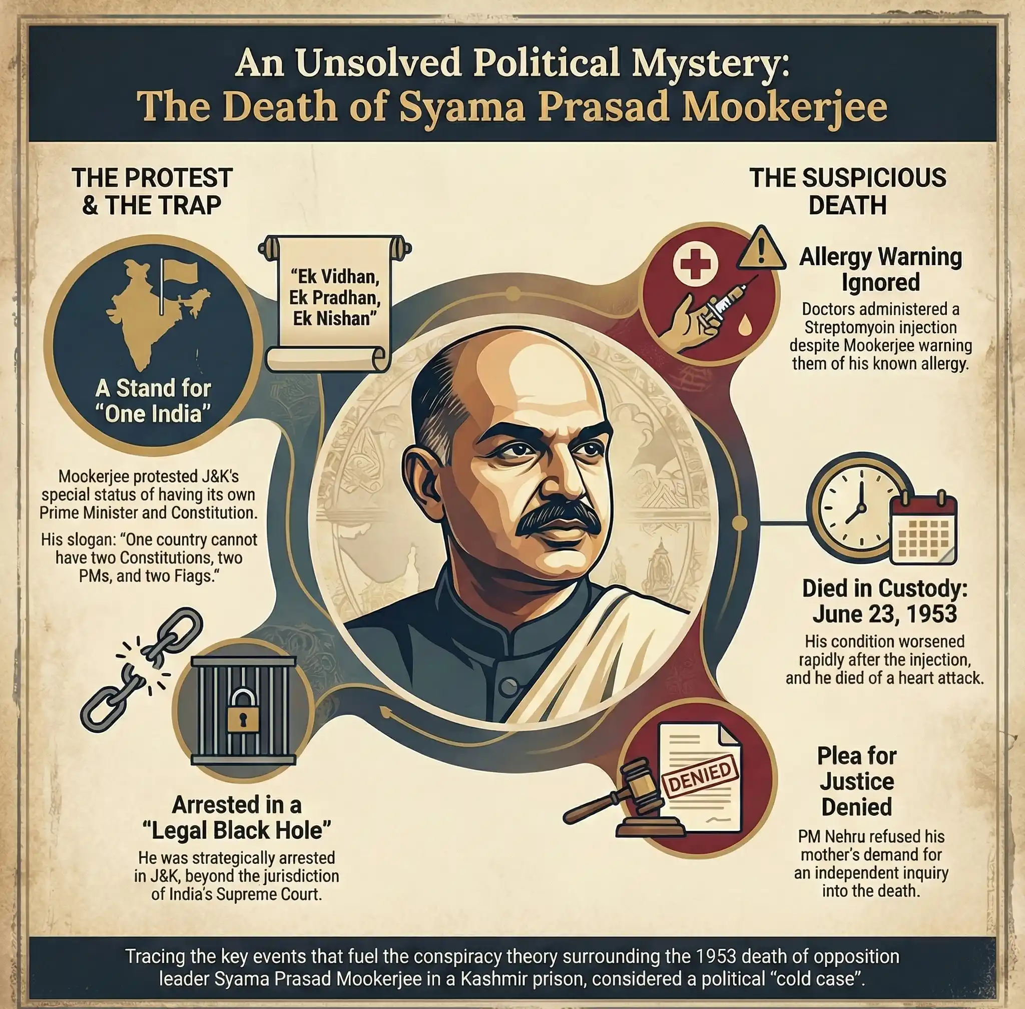 The Syama Prasad Mookerjee death mystery centers on the suspicious circumstances surrounding his detention in Srinagar in 1953. After being arrested in a location that barred intervention from the Indian Supreme Court, Mookerjee allegedly died of a heart attack. However, evidence suggests he was administered a drug he was known to be allergic to, and his personal records of the event went missing. Despite national outcry and his mother's demands, no formal inquiry was ever conducted.| Field | Details |