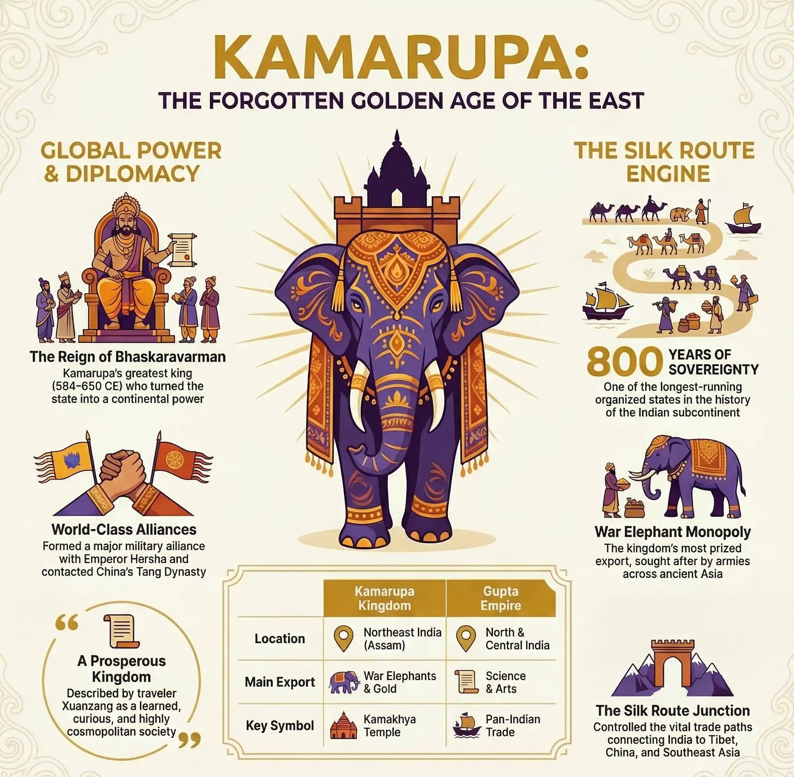 | Famous For | Ancient Silk Route trade, alliance with Emperor Harsha, Kamakhya Temple |