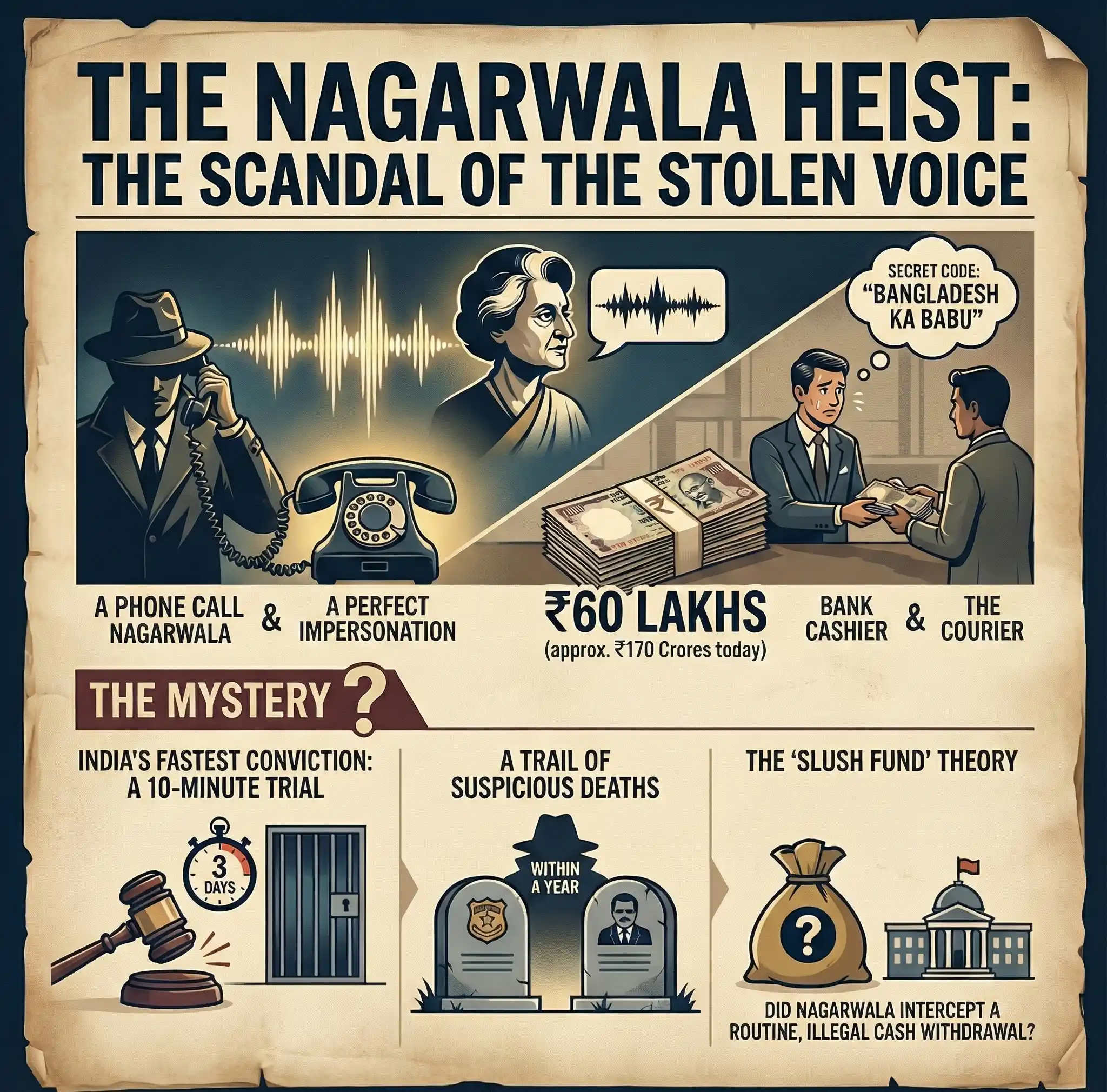 The 1971 Nagarwala Case involves Rustam Nagarwala, who defrauded the State Bank of India of ₹60 lakhs by mimicking Prime Minister Indira Gandhi’s voice to authorize a secret fund withdrawal. The chief cashier complied, handing over the cash for an alleged classified mission, but Nagarwala was arrested shortly after and later died in custody under suspicious circumstances. This incident remains one of India’s most controversial mysteries, raising lasting questions about political power and banking security during that era.| Category | Details |