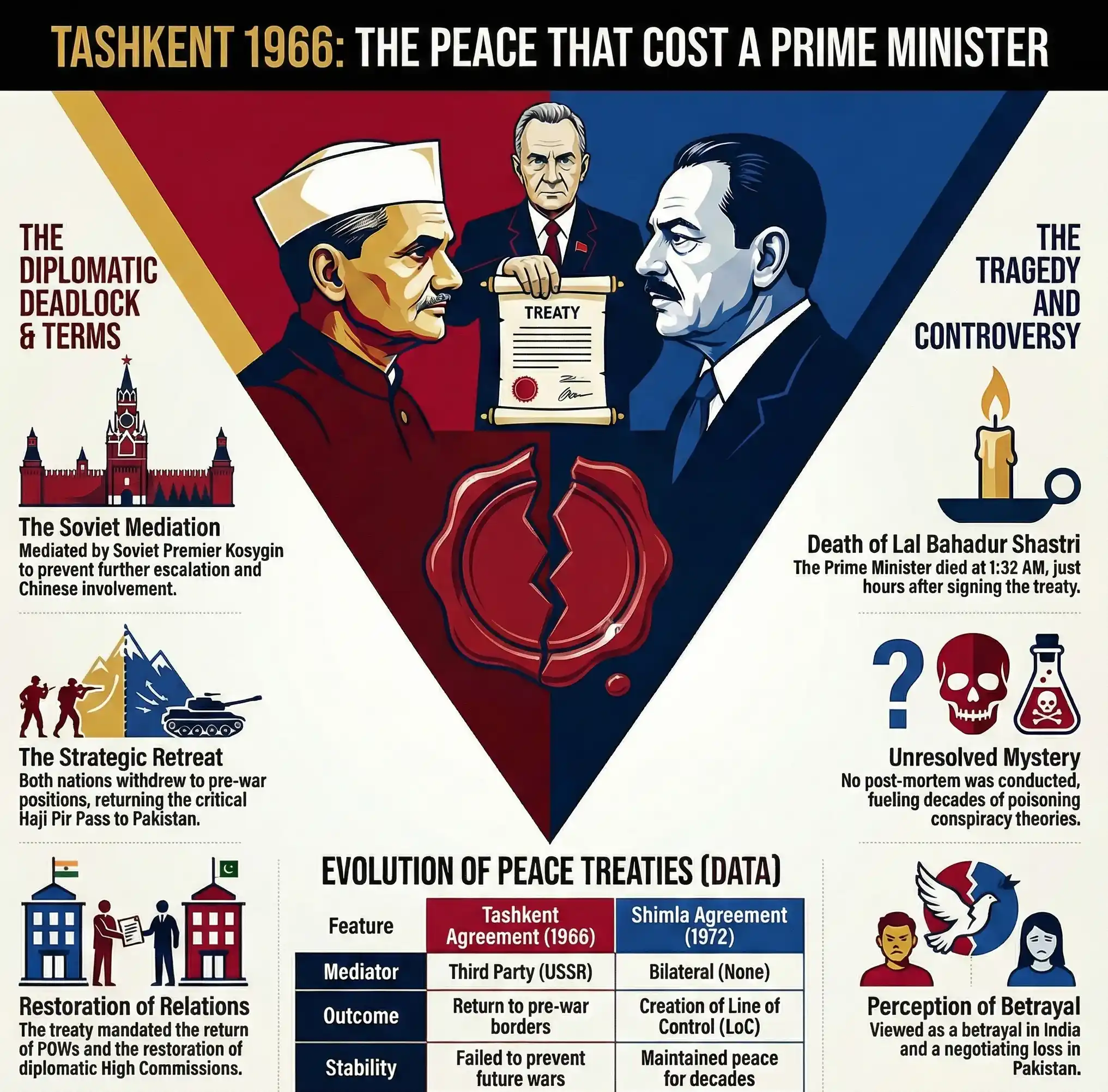 The Tashkent Agreement was signed on January 10, 1966, between Indian Prime Minister Lal Bahadur Shastri and Pakistani President Ayub Khan. Mediated by Soviet Premier Alexei Kosygin in Tashkent (modern Uzbekistan), it formally ended the Indo-Pak War of 1965. The treaty mandated that both armies withdraw to their pre-war positions, effectively returning the captured strategic Haji Pir Pass to Pakistan. While it restored diplomatic relations, it was heavily criticized in both countries for failing to address the core issue of Kashmir. The agreement is forever overshadowed by the tragic death of Lal Bahadur Shastri just hours after signing it, sparking decades of conspiracy theories.| Feature | Details |